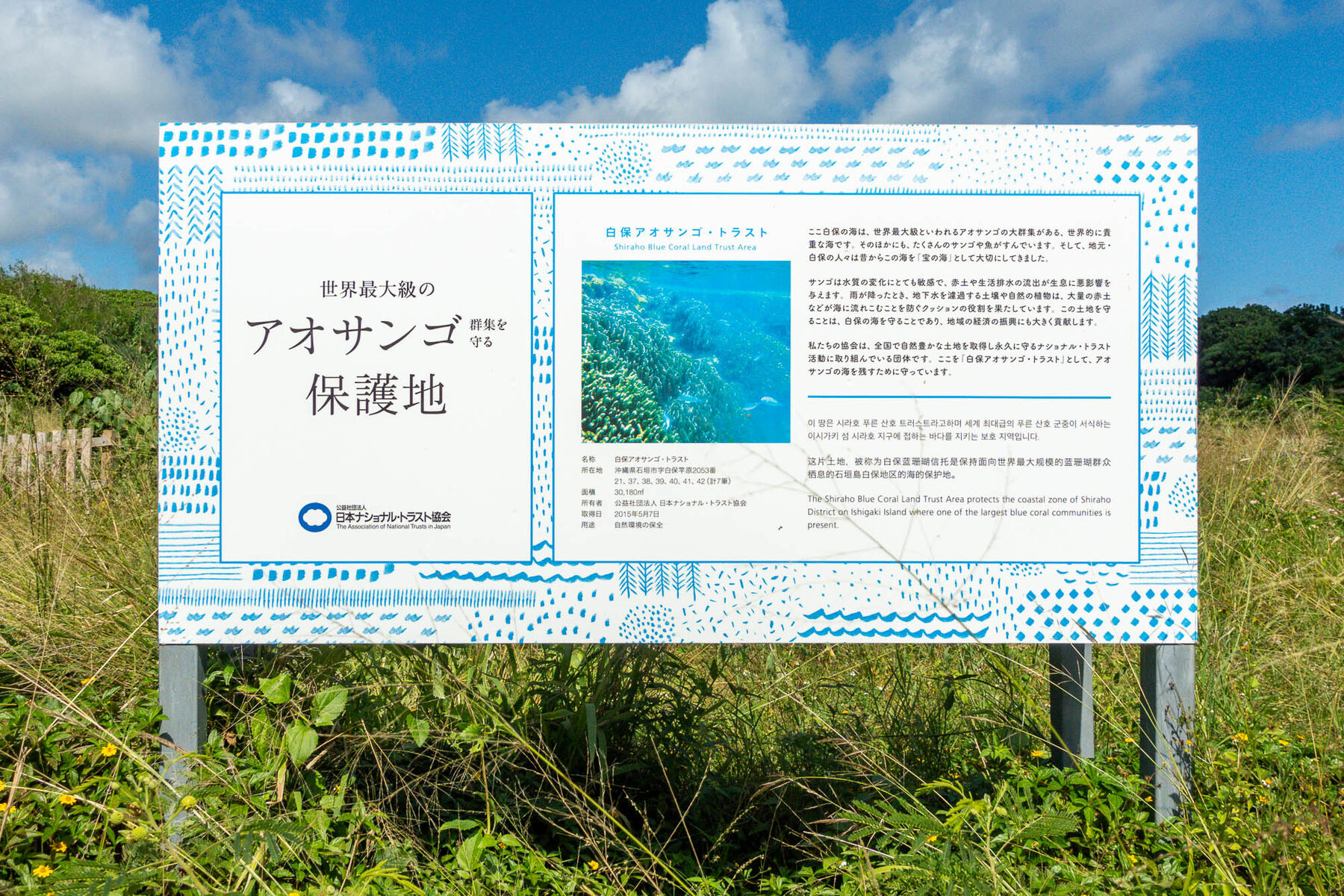 看板によると、白保アオサンゴ・トラストはアオサンゴの保護地なんだそう!世界最大級といわれるアオサンゴの大群集がある、世界的に貴重な海なんだとか!