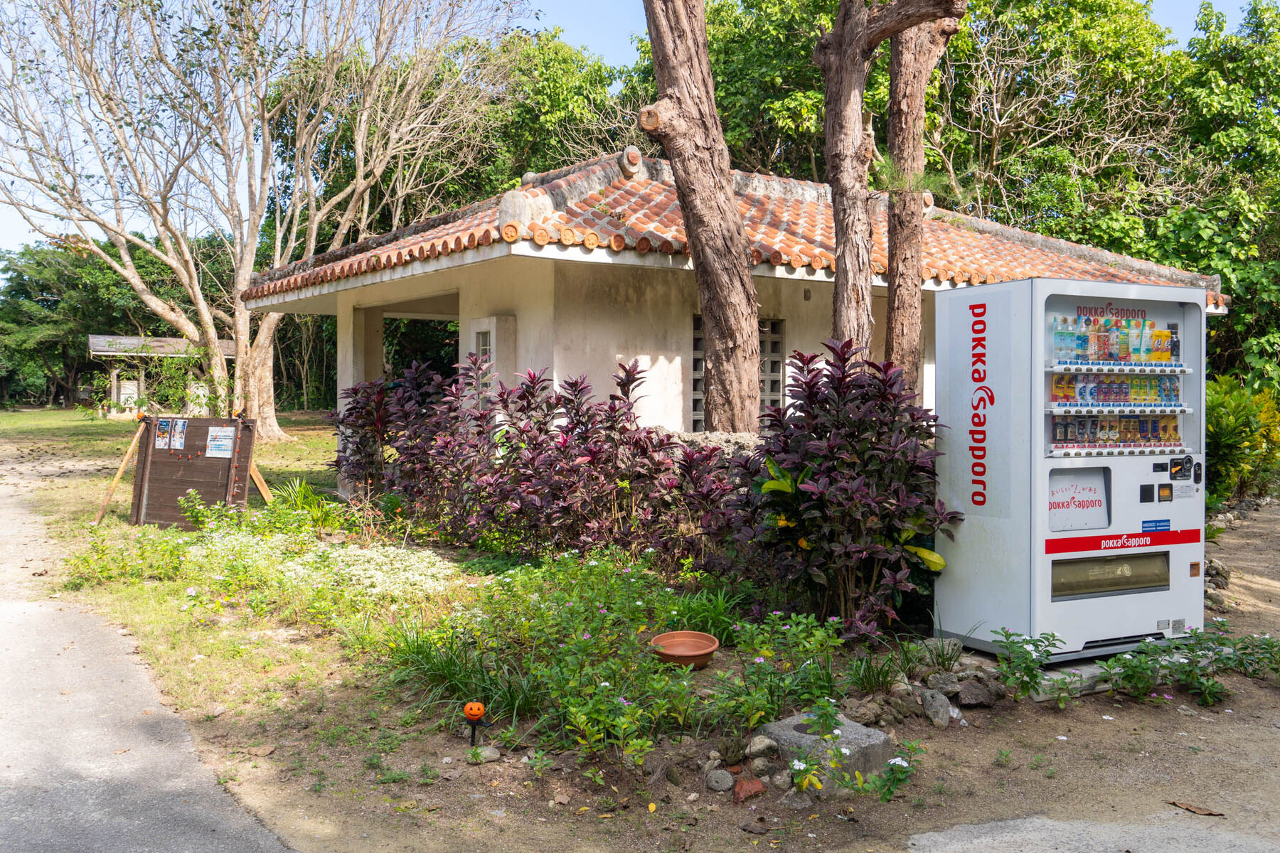 ビーチの少し手前にトイレと自動販売機があります。