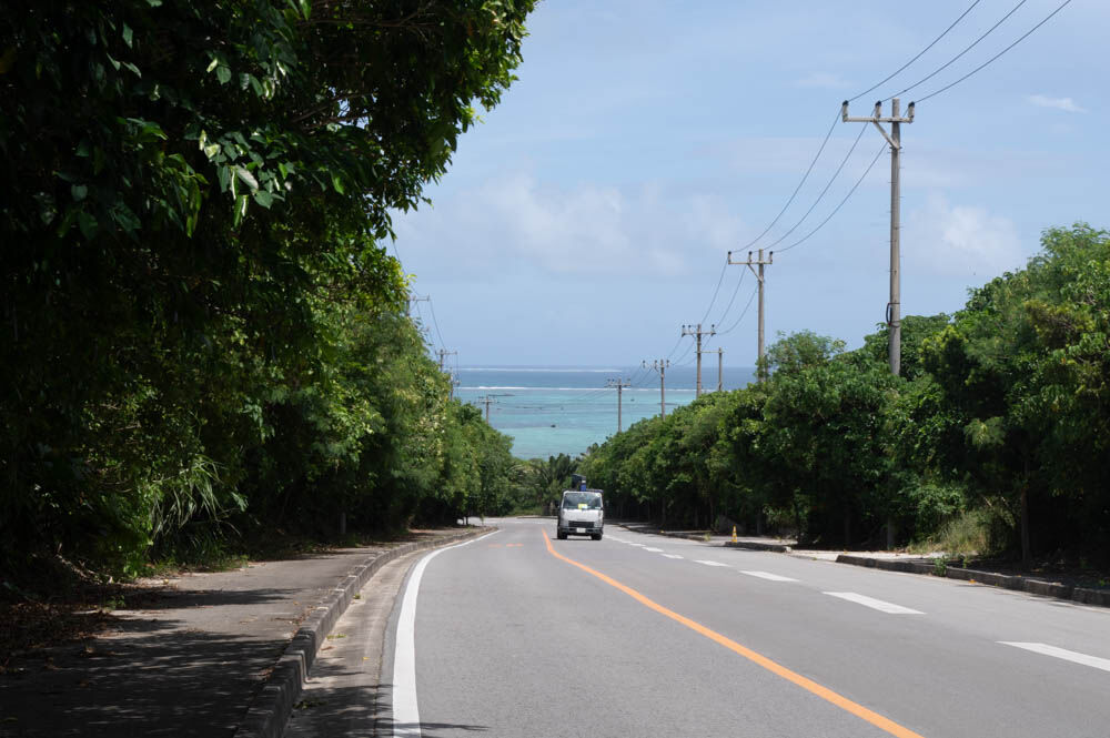 エメラルドグリーンの海を背景にドライブできるのは石垣島の特権!