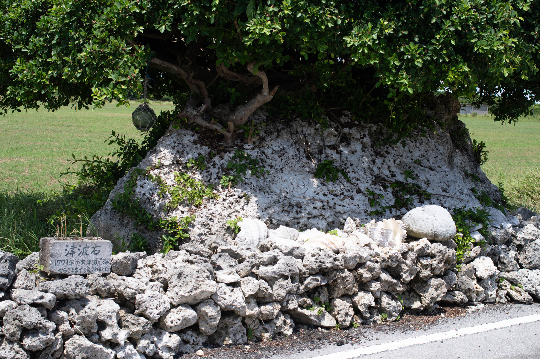 途中ハートのガジュマル、津波石(1771年にあった八重山地震の際の津波で打ち上げられた珊瑚礁の一部)などの前を通り「黒島灯台」へ。