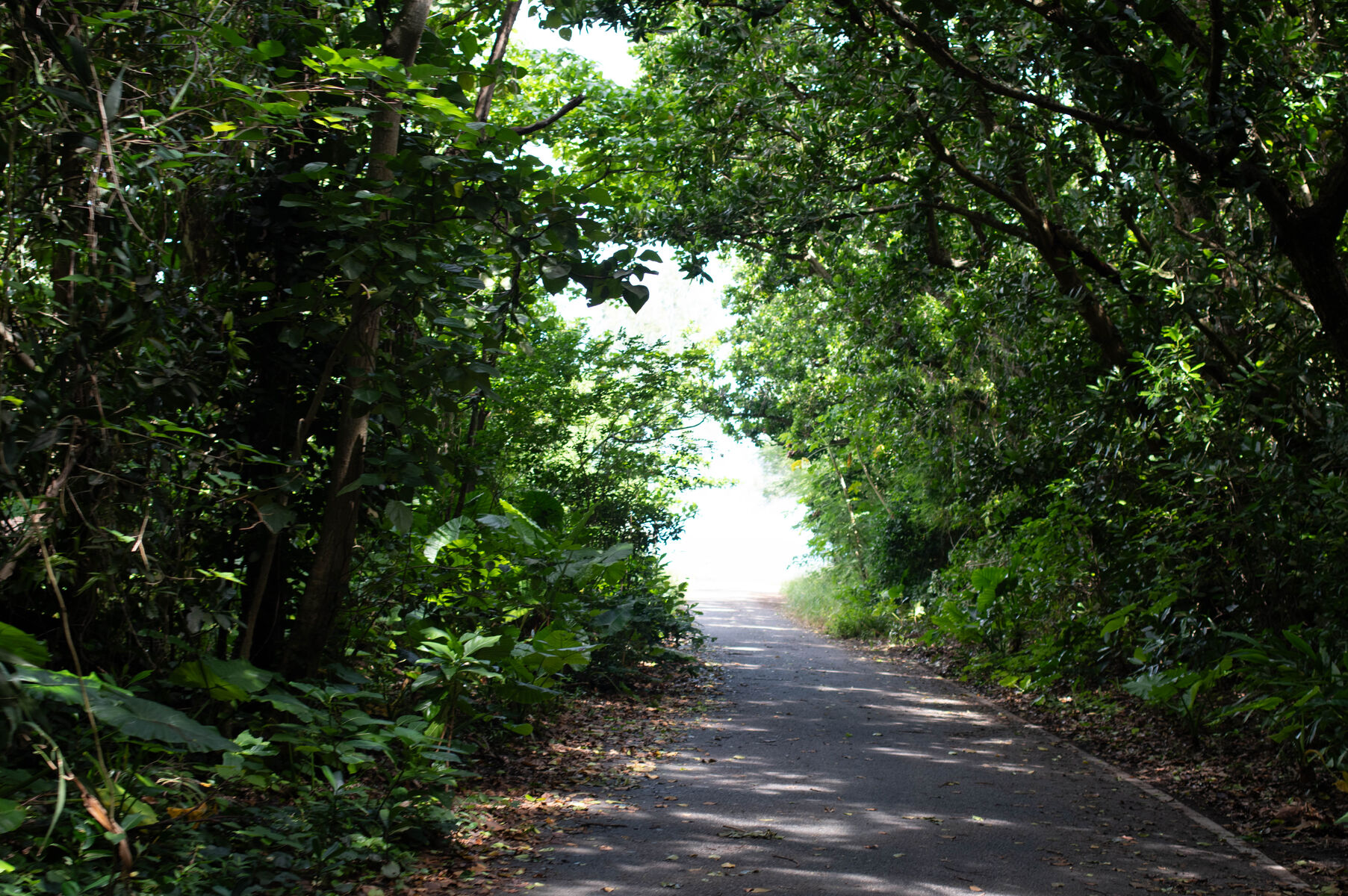 なんとか、険しい草むらを自転車で無理やり進んで聞くと見えてくる木漏れ日ロード。
