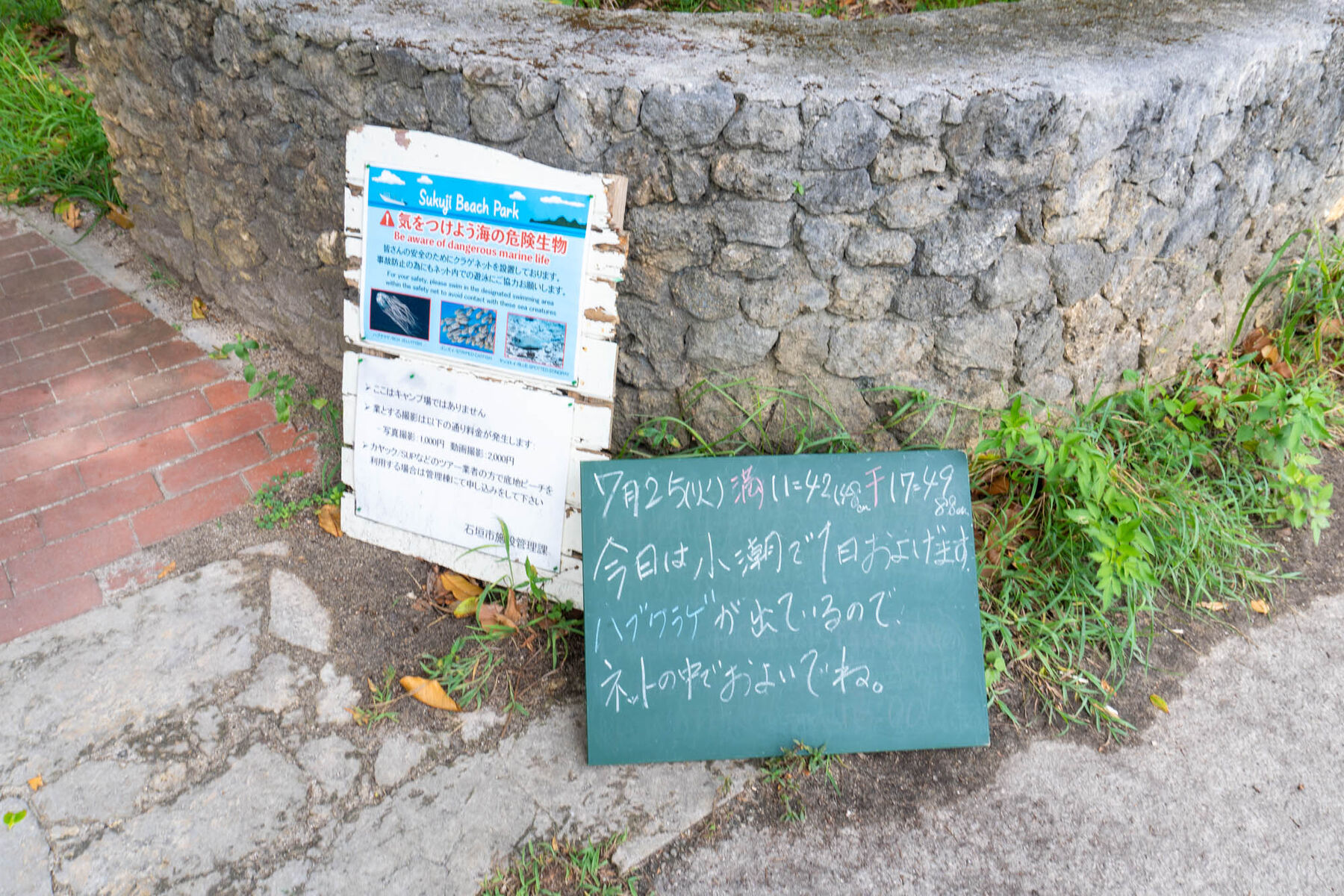 ビーチの入り口には満潮、干潮の時刻が。