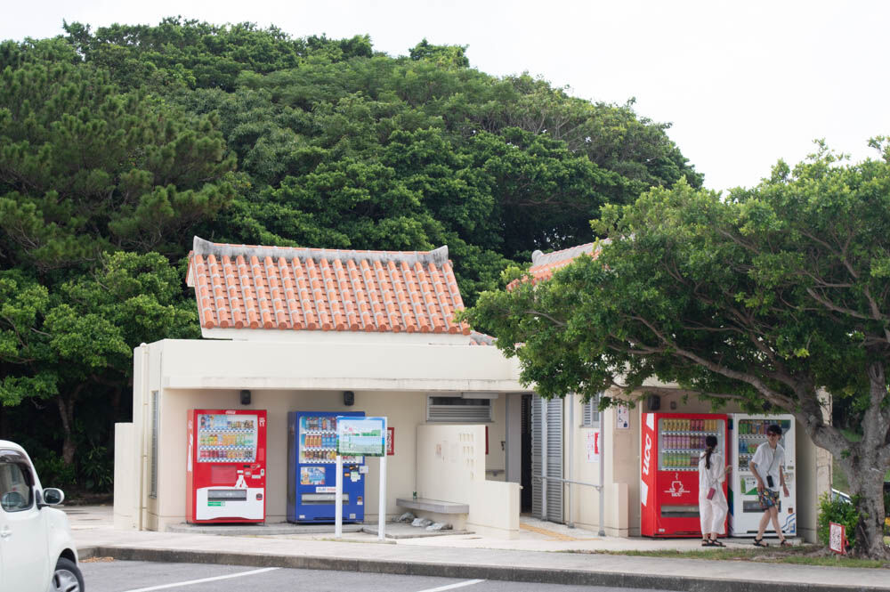 沖縄らしい赤瓦屋根の公衆トイレ、沖縄らしいラインナップの自動販売機があります。