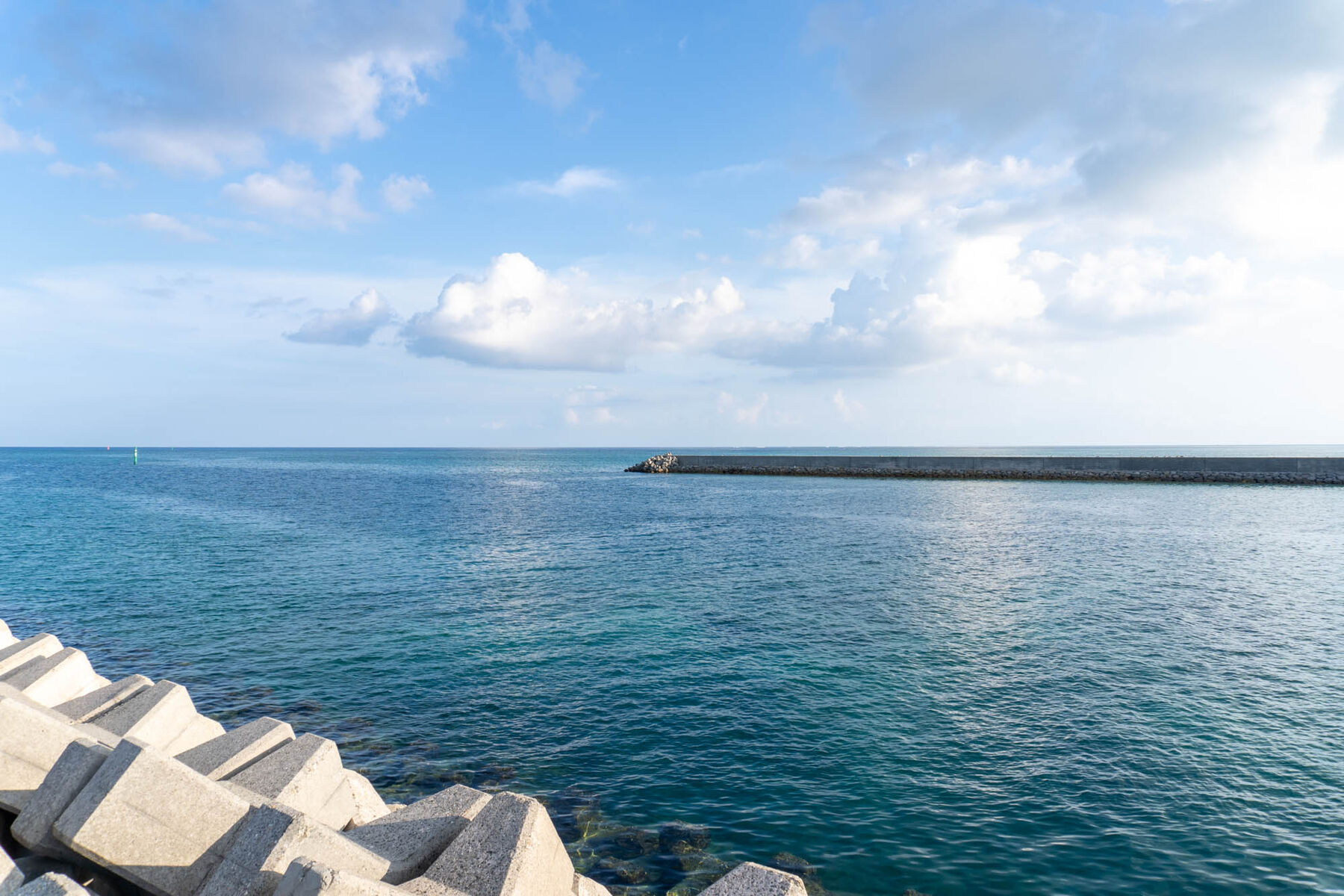 まっすぐと広がる水平線。防波堤とは思えないこの海の青さ!
