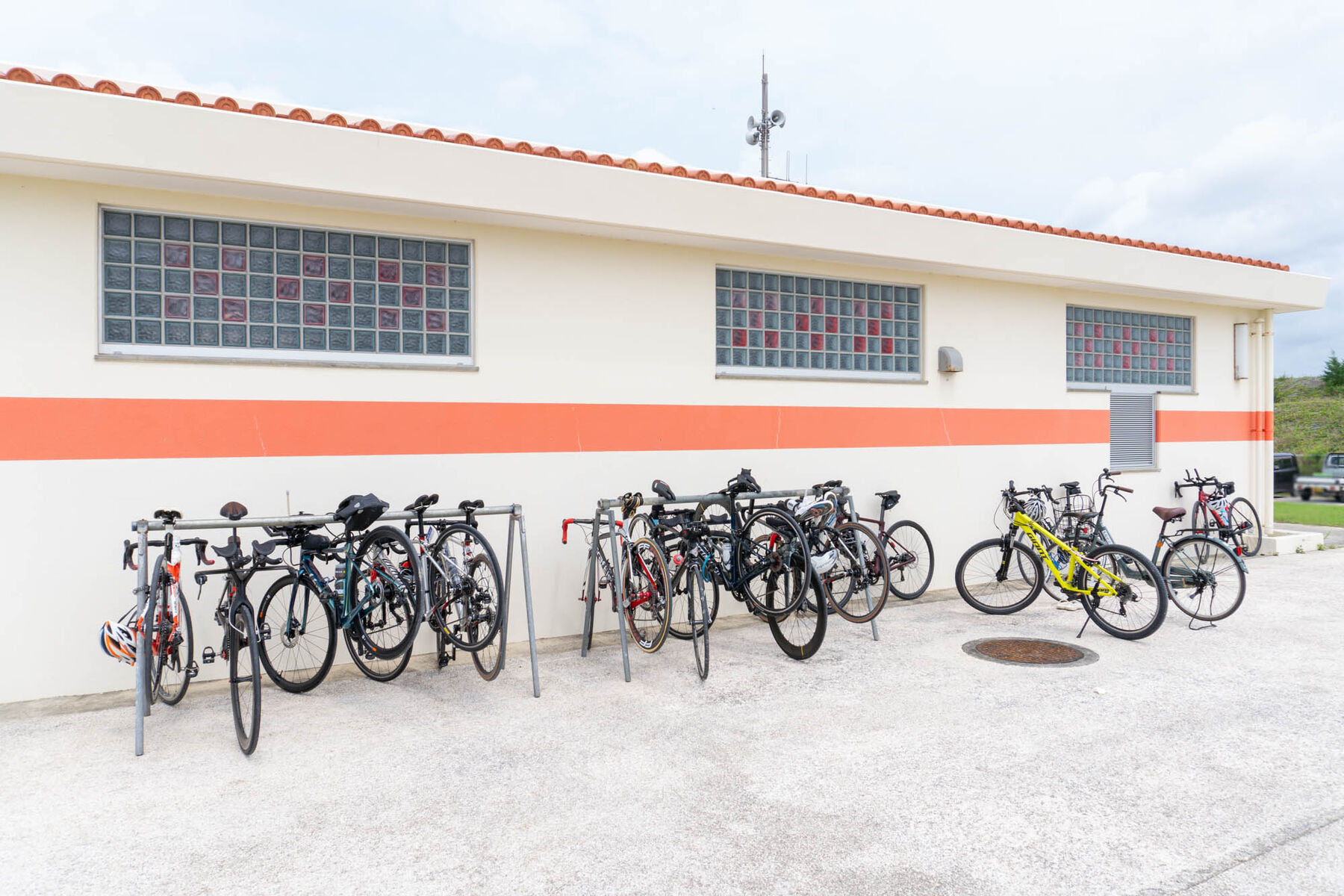 管理棟横には競技用バイクがずらり。スイム会場へはバイクで来られている方が多かったです。