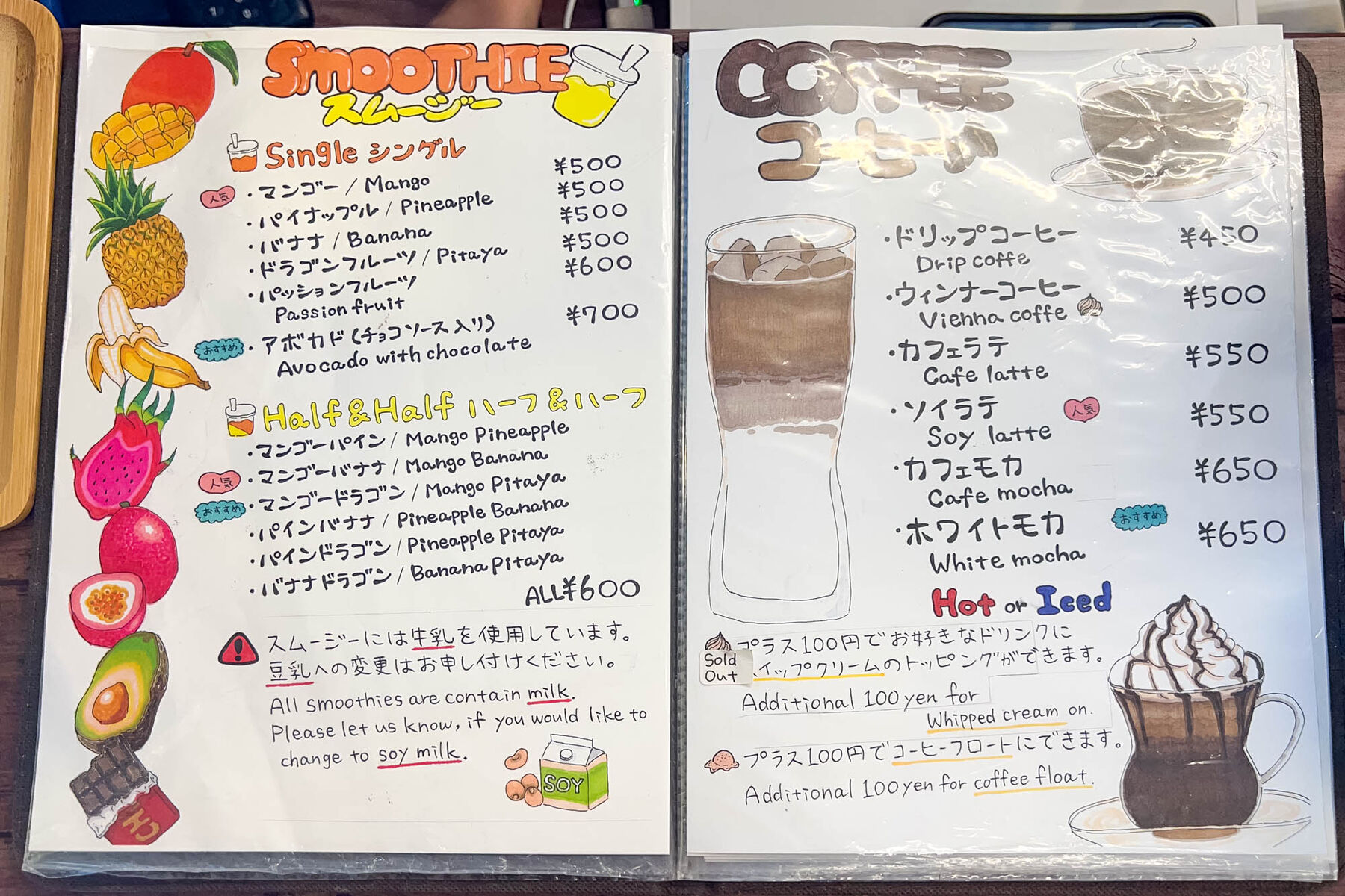 南国フルーツを使用したスムージーやコーヒーメニューから、