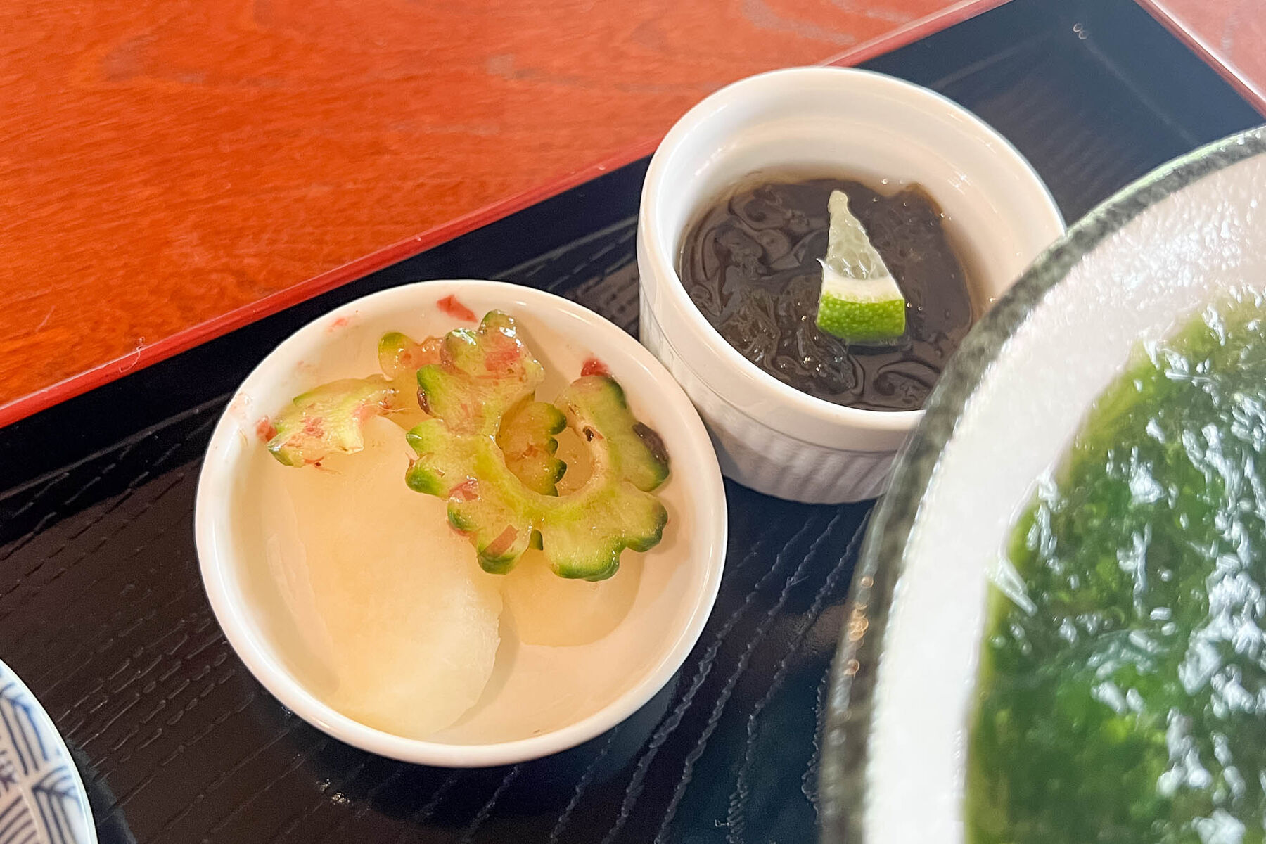 忘れちゃいけないのが小鉢のもずく酢と、箸休めのお漬物。
