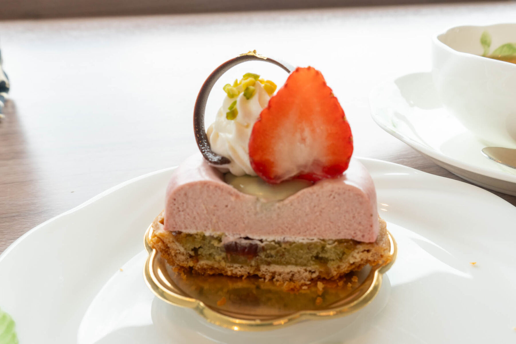 イチゴとピスタチオのムースと、セットのドリンクは紅茶をチョイス。