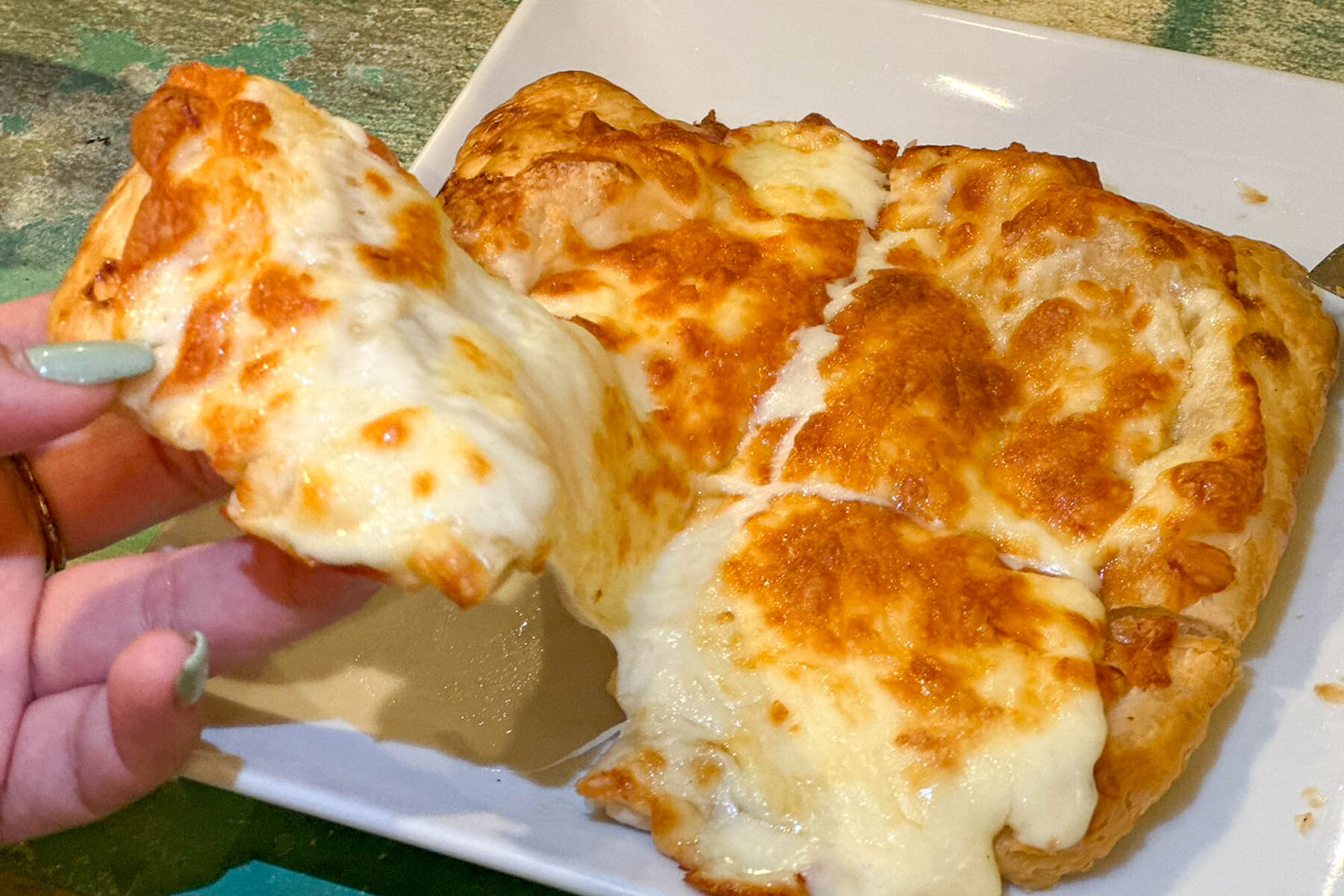 はい、大正解!見てくださいこの伸びてるチーズ!これでもか!ってくらいのチーズがのっていてチーズ好きにはたまらない一品。ピザの生地はパイっぽくて、サクサクで甘い〜!