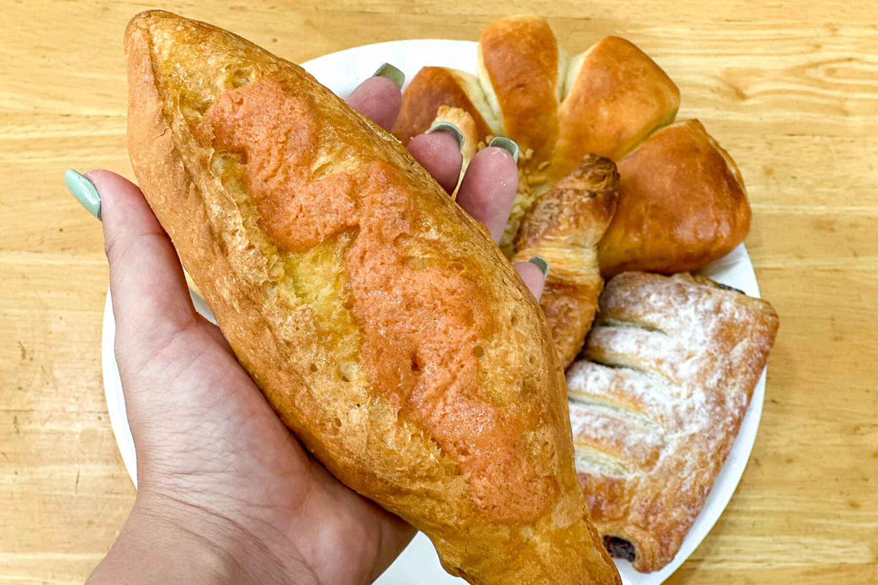今回購入したパンの中で1番インパクトがあったのは「明太フランスパン」!中にも明太子のペーストが入っていて、かなり明太子を感じる!