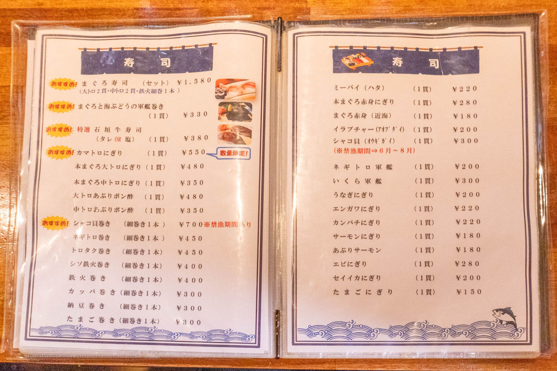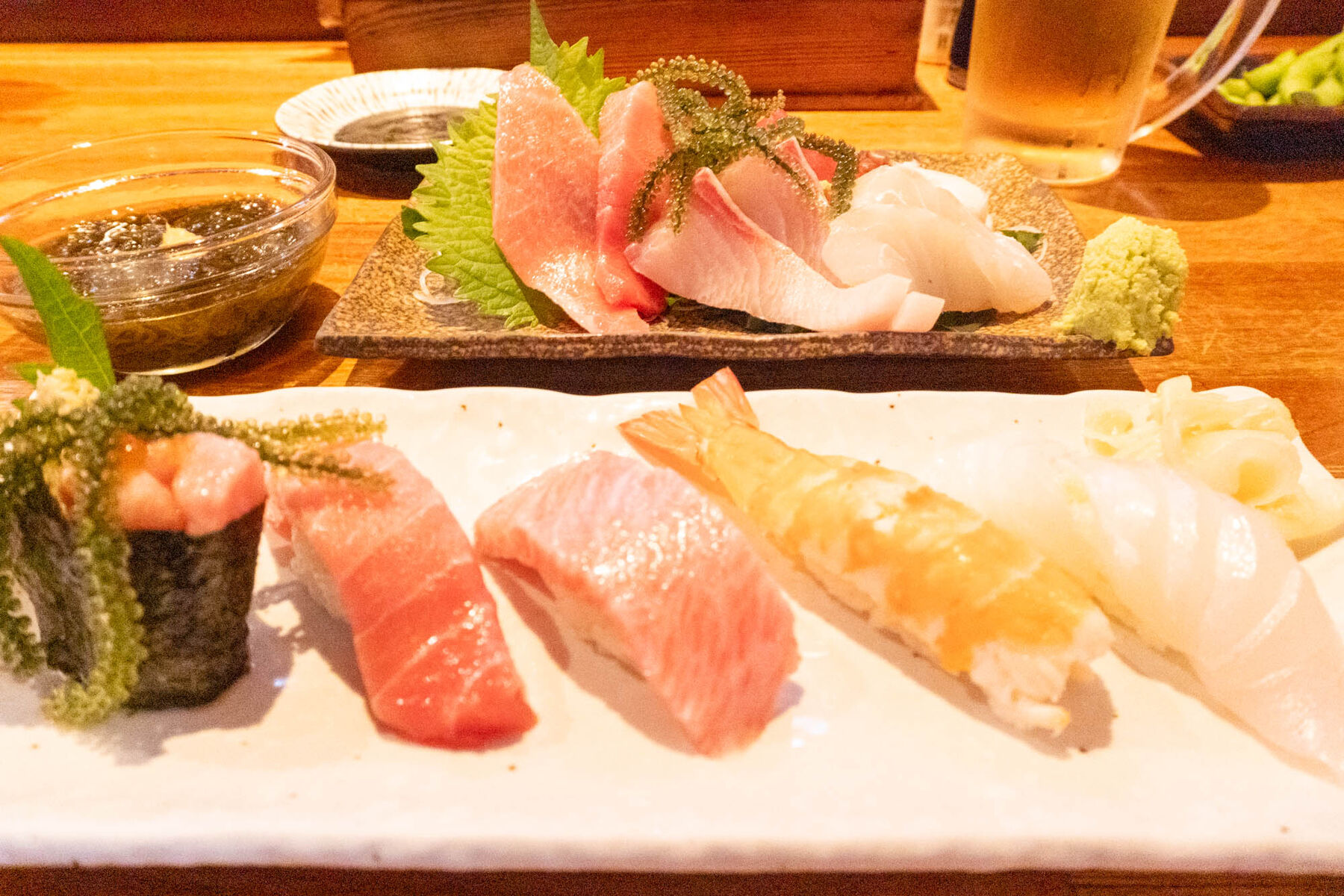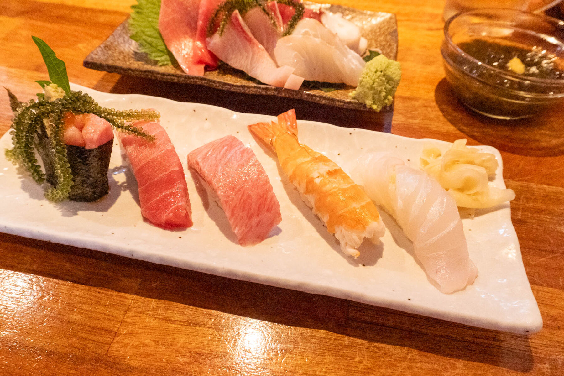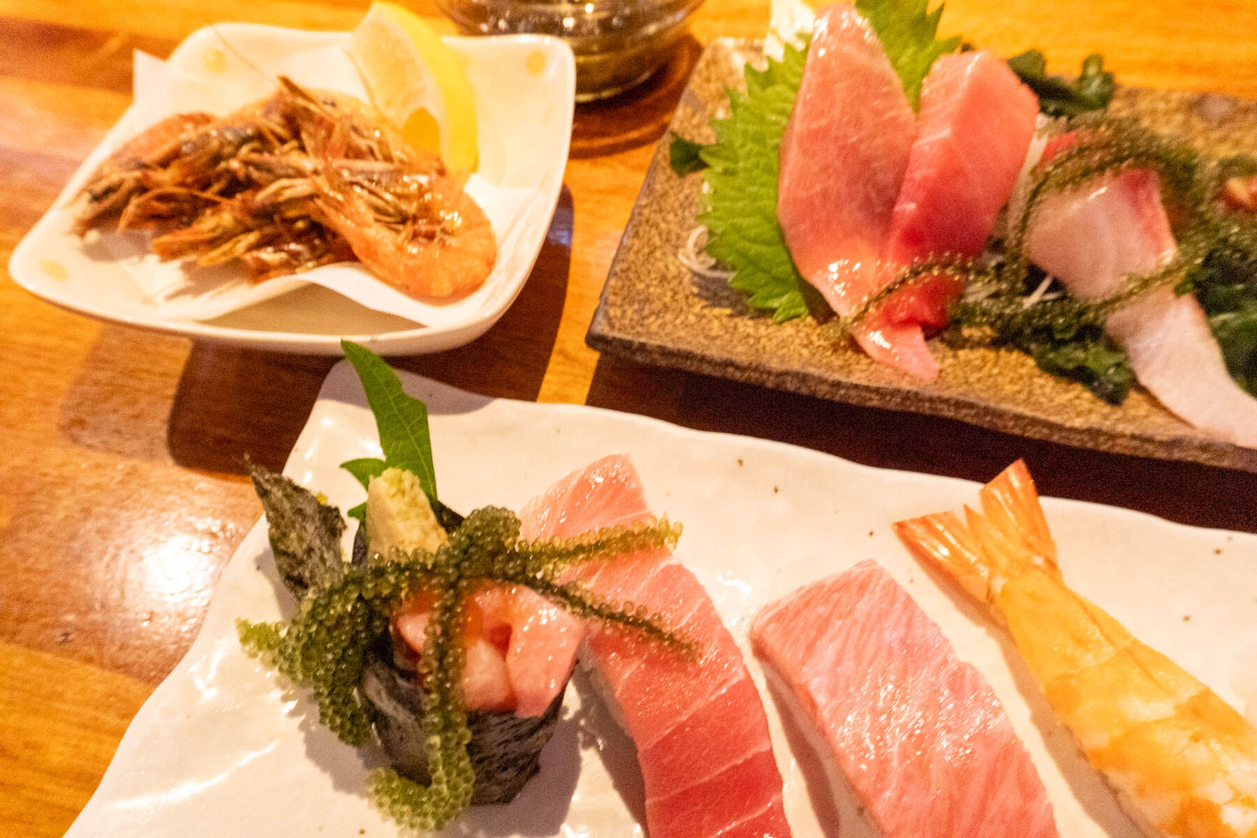 左から、まぐろと海ぶどうの軍艦巻き(1貫 330円)、本まぐろ中トロにぎり (1貫 350円)、本まぐろ大トロにぎり (1貫 480円)、エビにぎり (1貫 280円)、ミーバイ (1貫 220円)をいただきましたー!!
