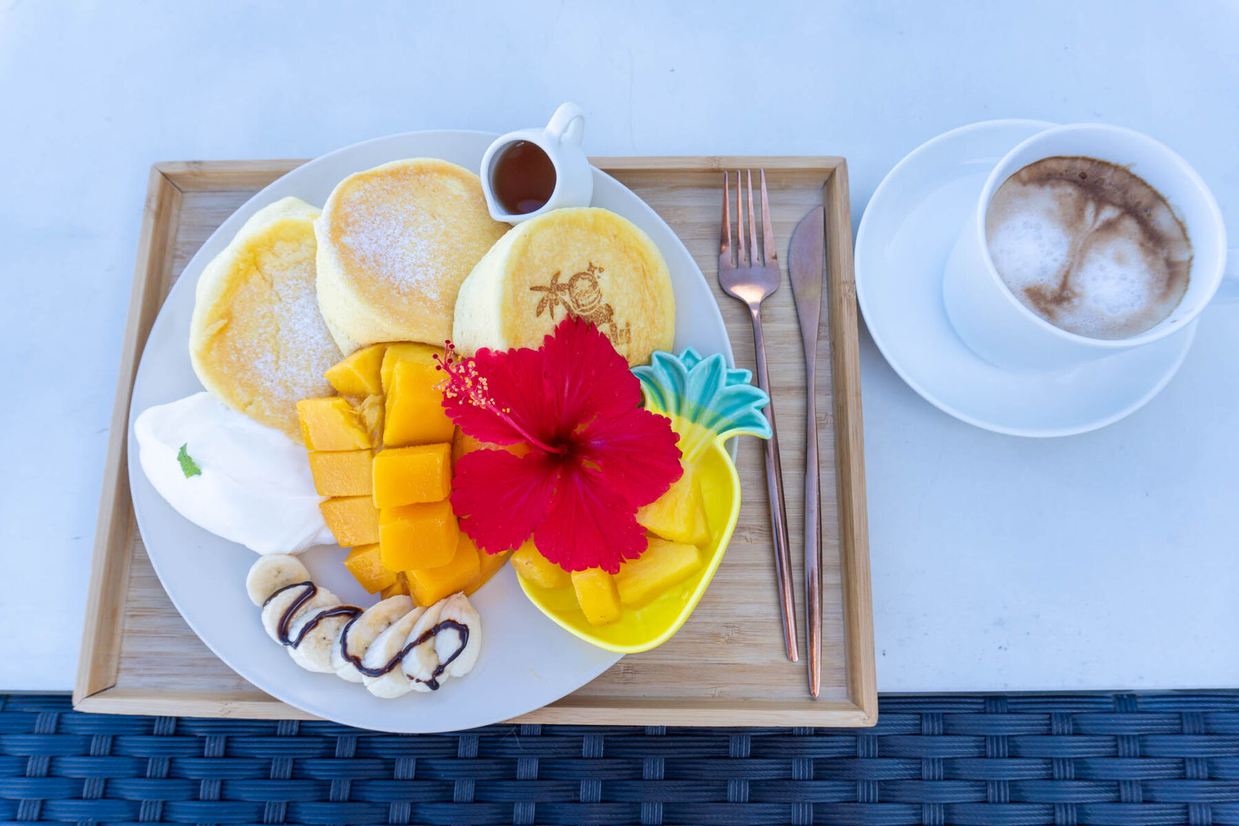 今回は贅沢に「石垣島産フルーツ全部のせパンケーキ」と『カフェラテ (ホット 650円)』をオーダーしました〜