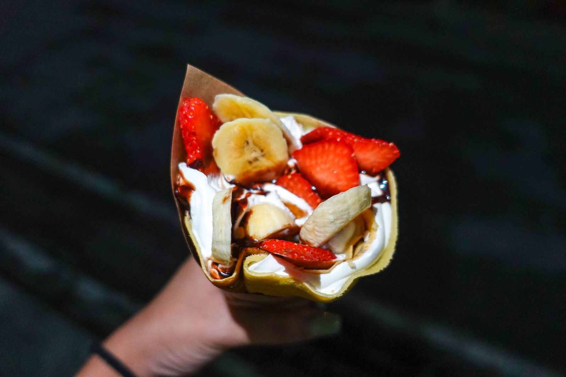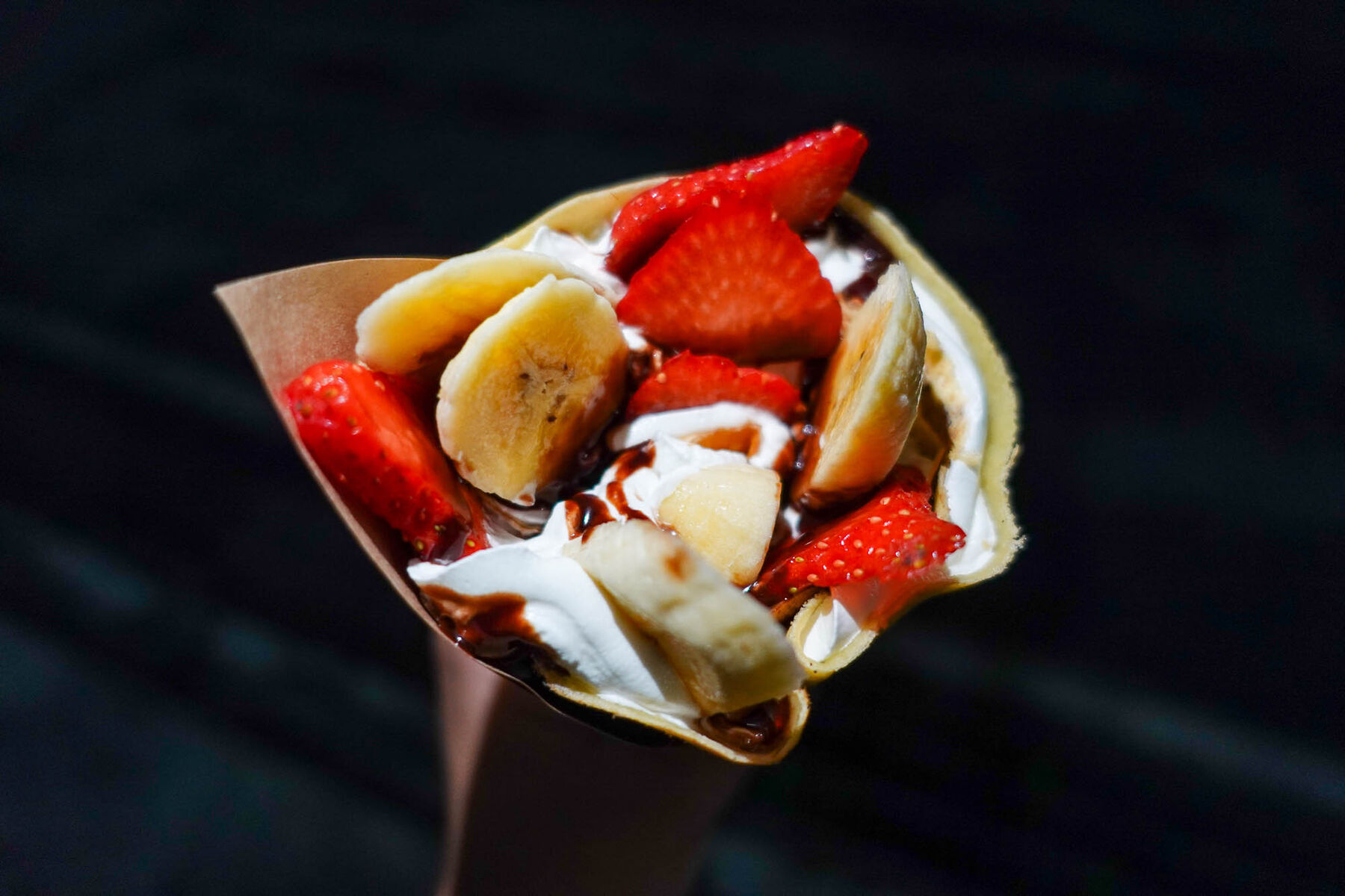 ホイップに埋め込まれているバナナといちご。ビジュアル最高です、、