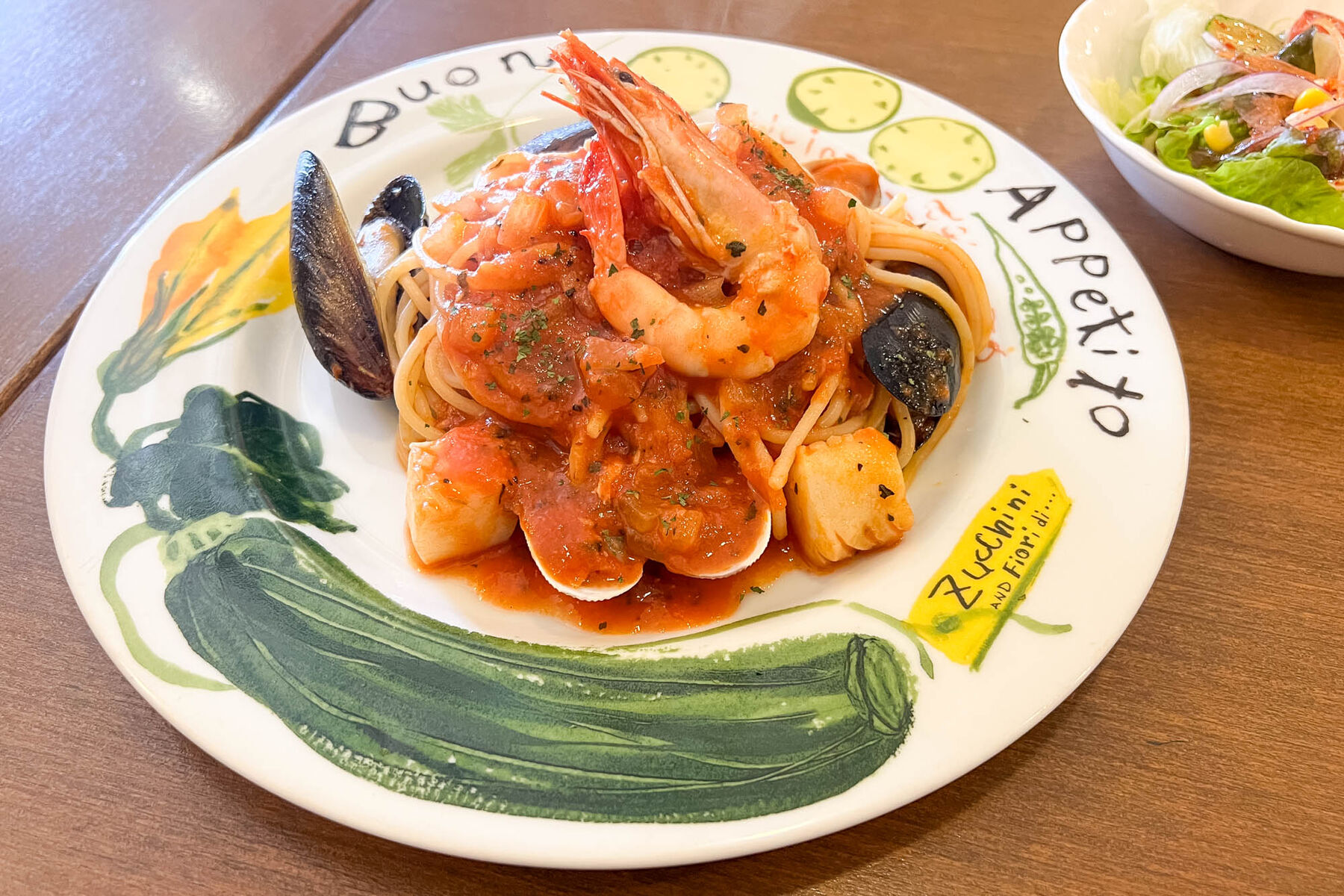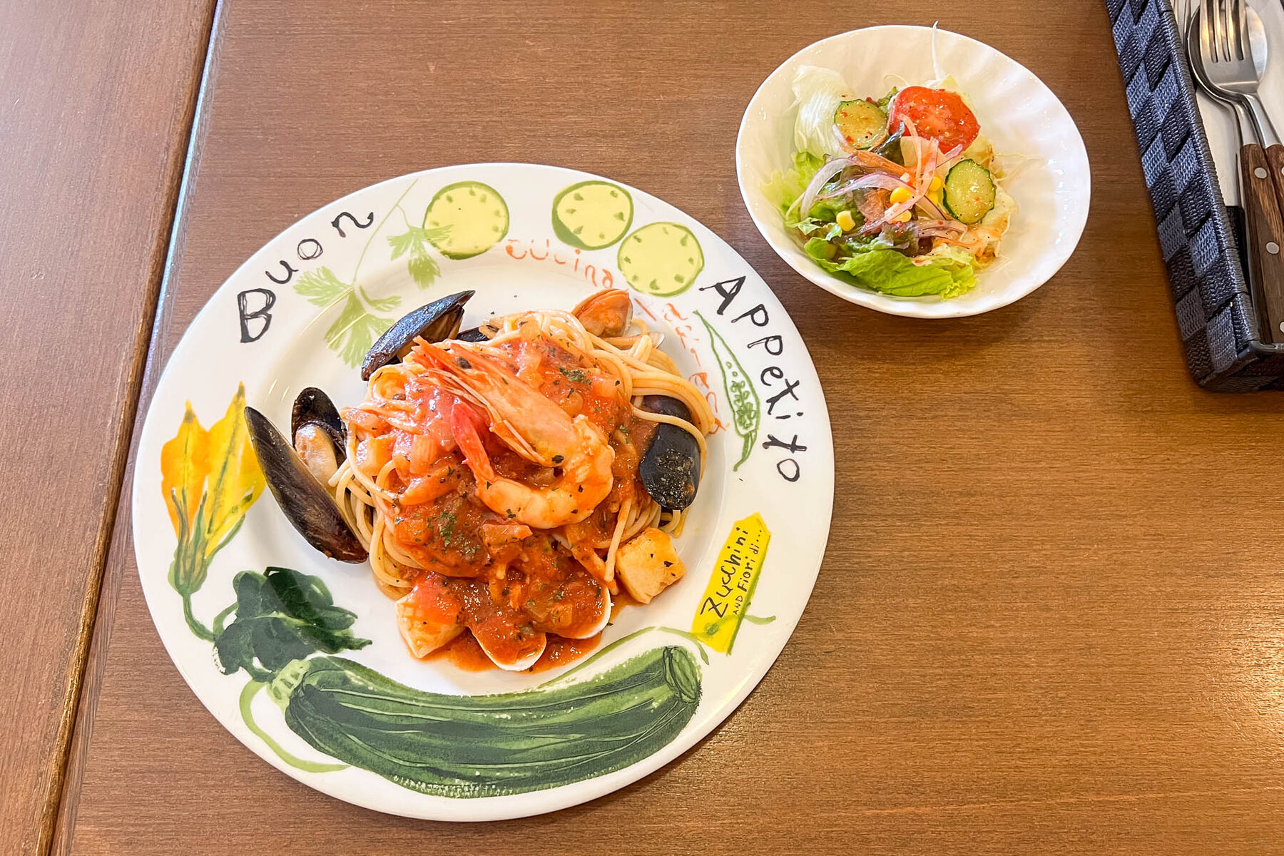 この日はペスカトーレにサラダとドリンクのセットを追加しました〜。