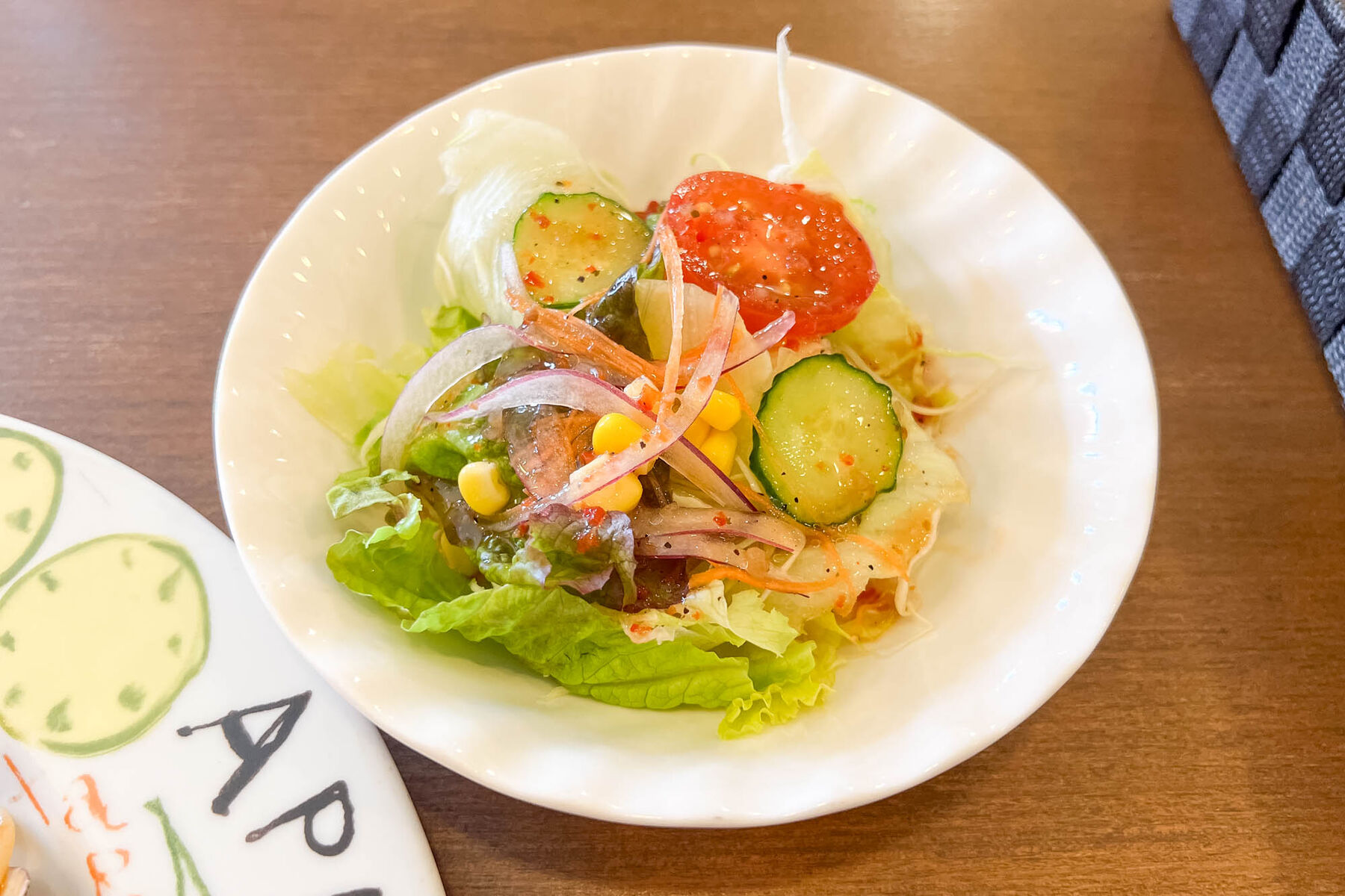 グリーンサラダにイタリアンドレッシンがオンされていましたよ〜。