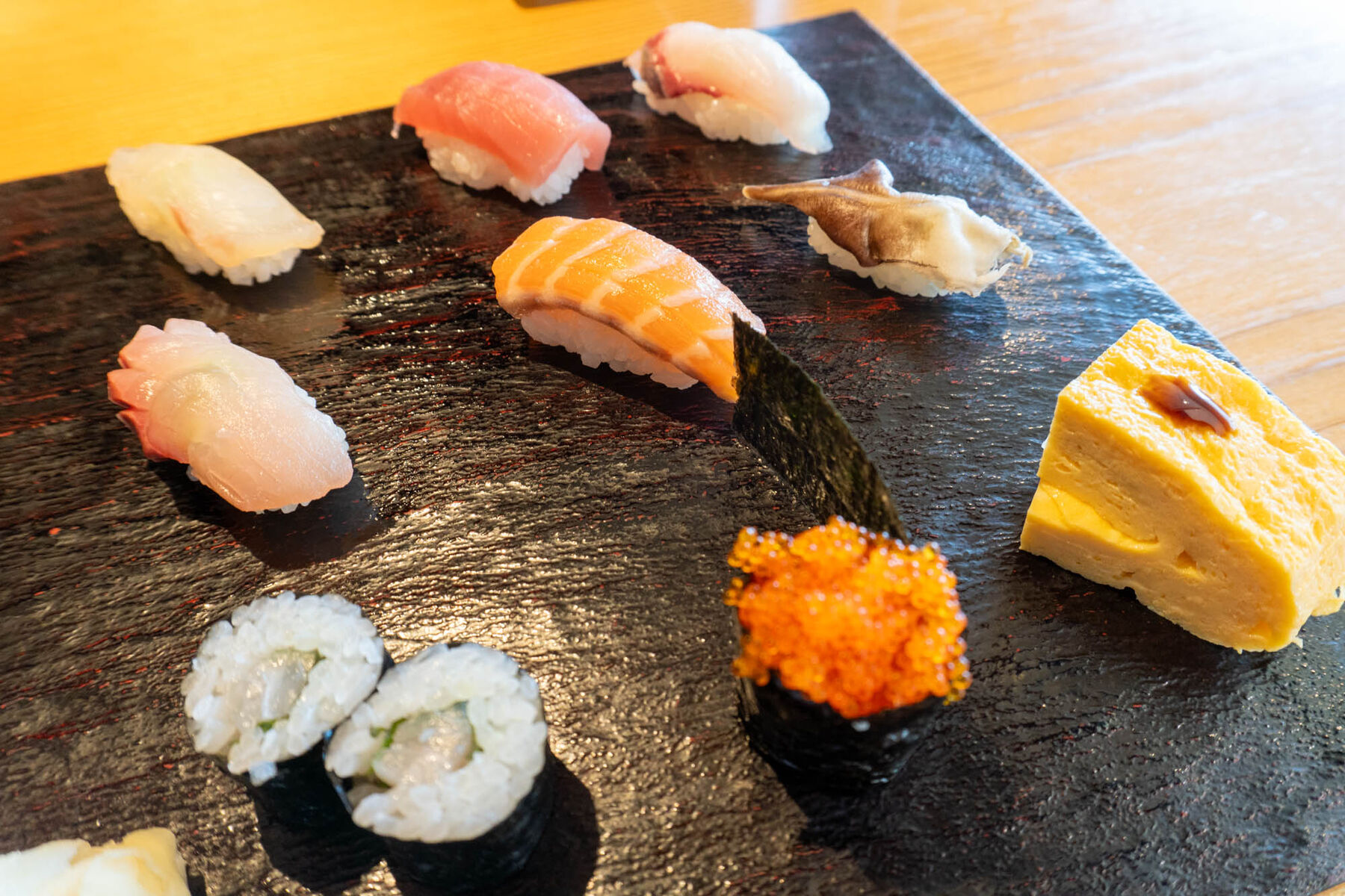 おしゃれなお皿に等間隔に並べられたお寿司たち・・・食欲をそそられます・・!