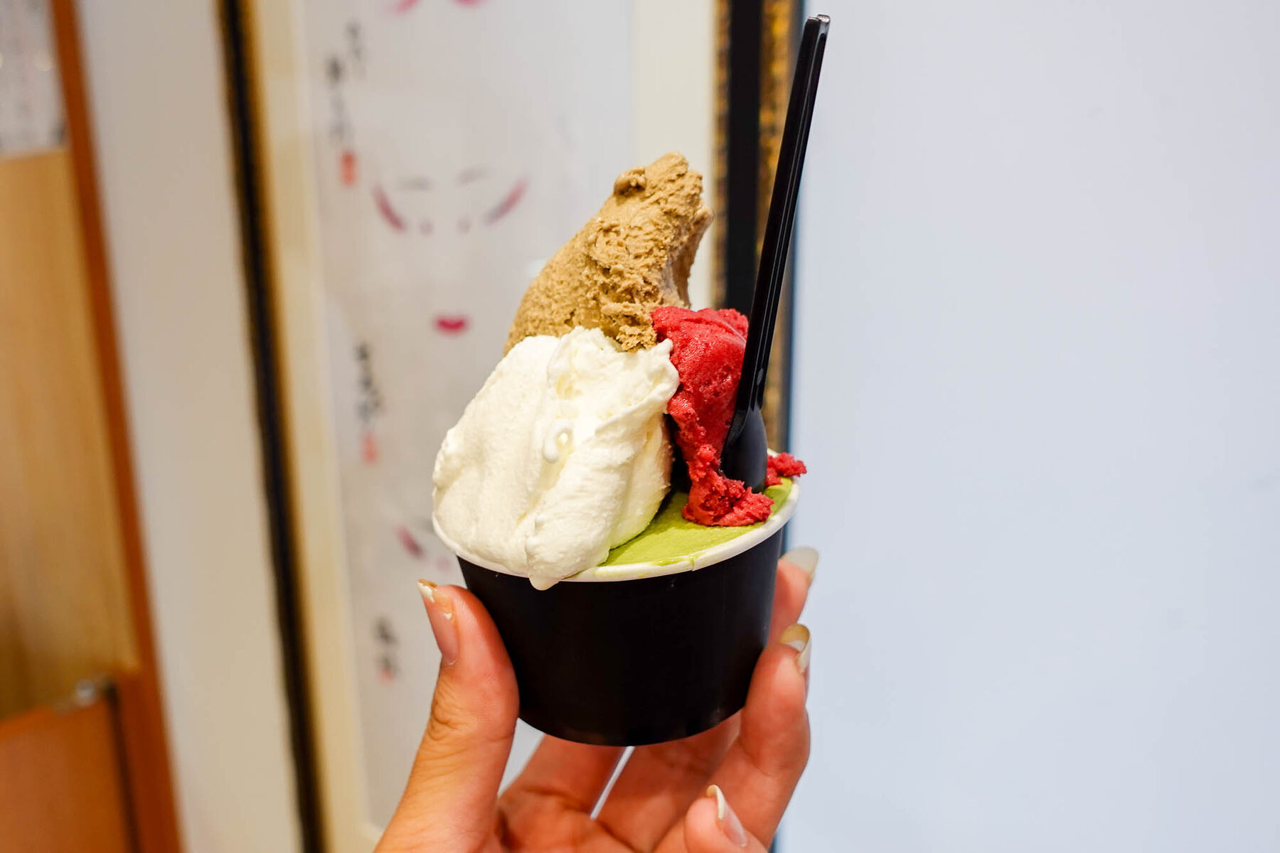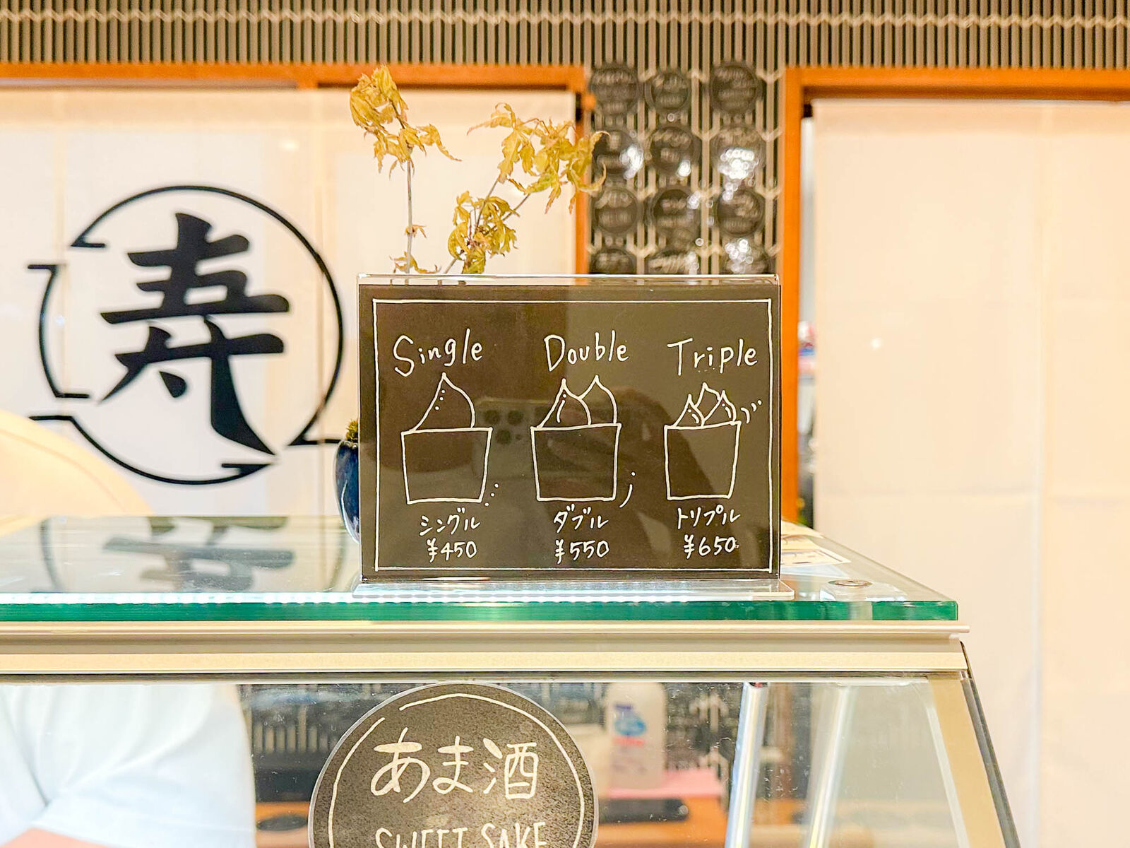 この日のフレーバーのラインナップはこんな感じ。日によってフレーバーが変わるとのこと。今回は「抹茶・ほうじ茶・あま酒」を選びました!