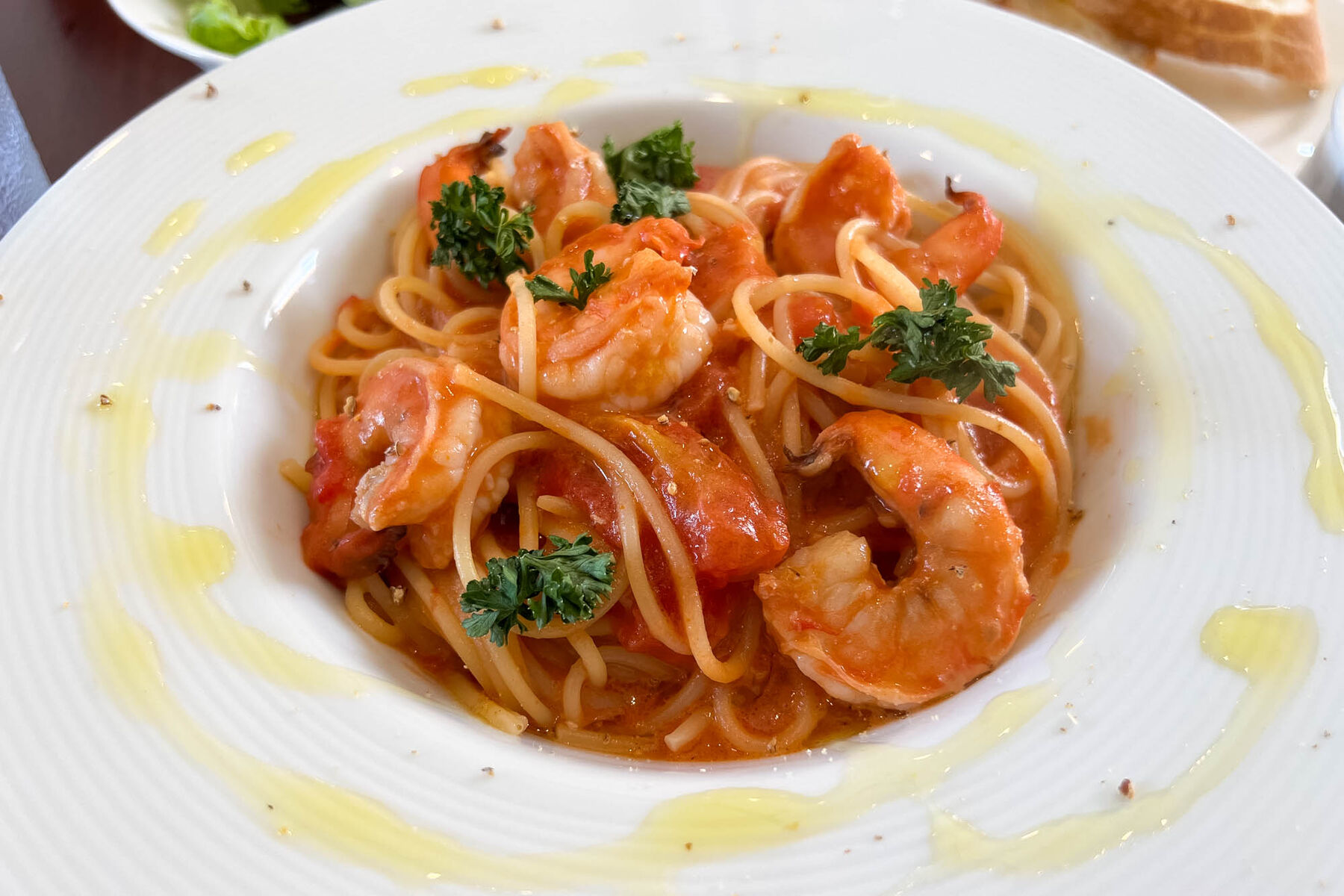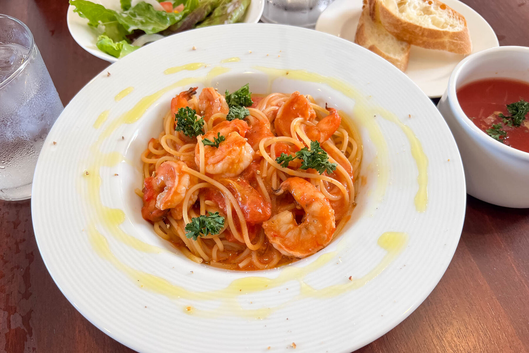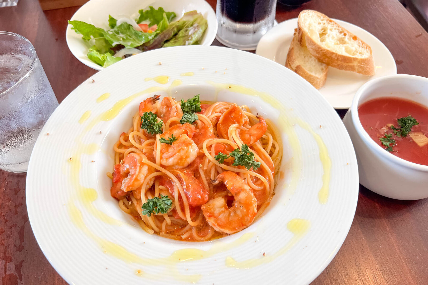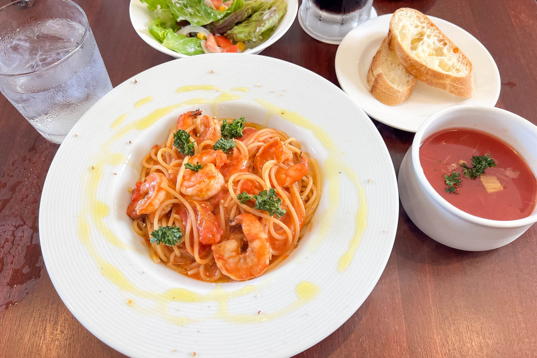 この日は海老のトマトクリームパスタにランチセットA(ミニサラダ+バゲッド+ソフトドリンク)を注文しました〜。