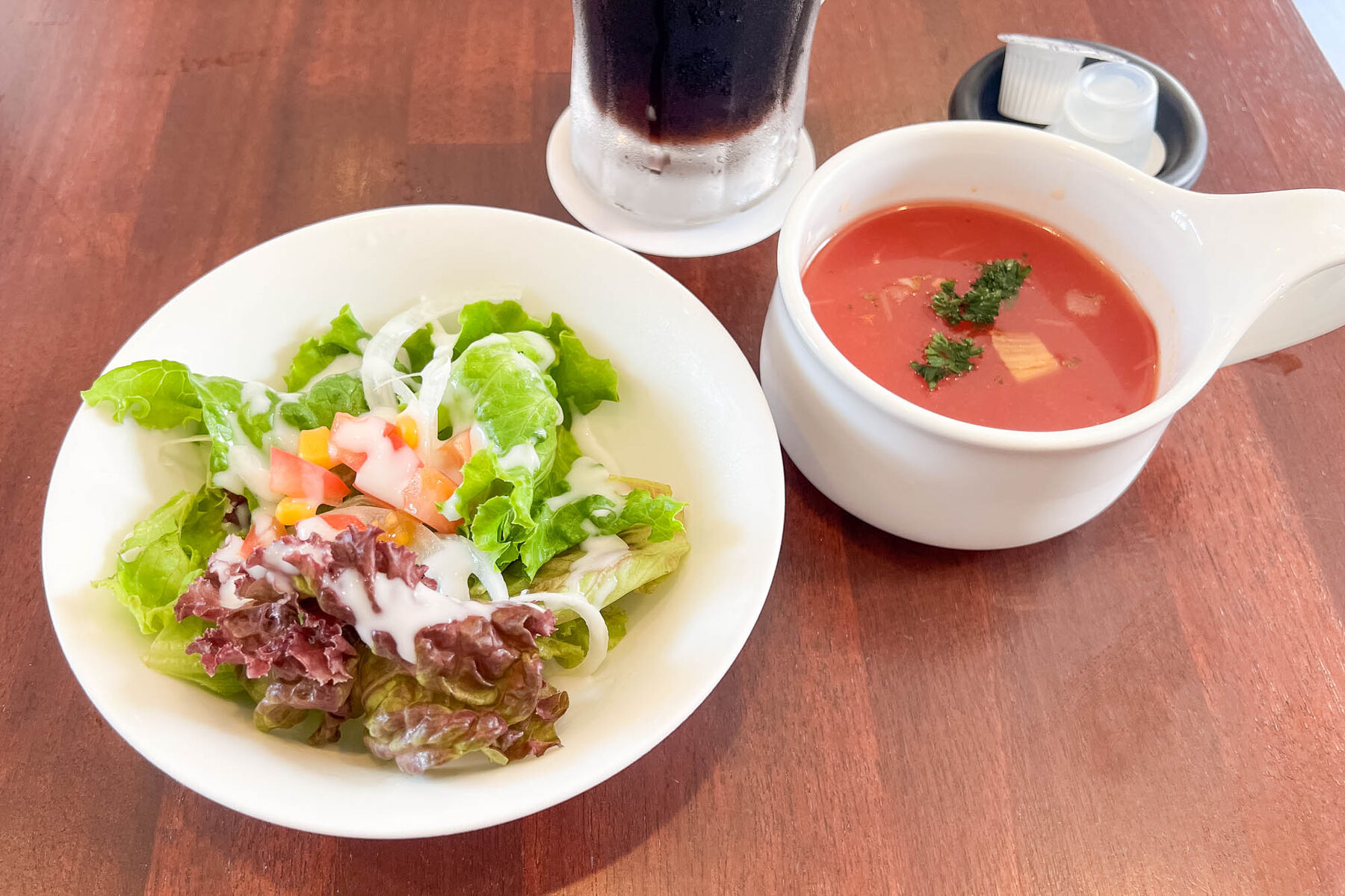 まずはセットのサラダとスープ。この日のスープは冷製のミネストローネ。
