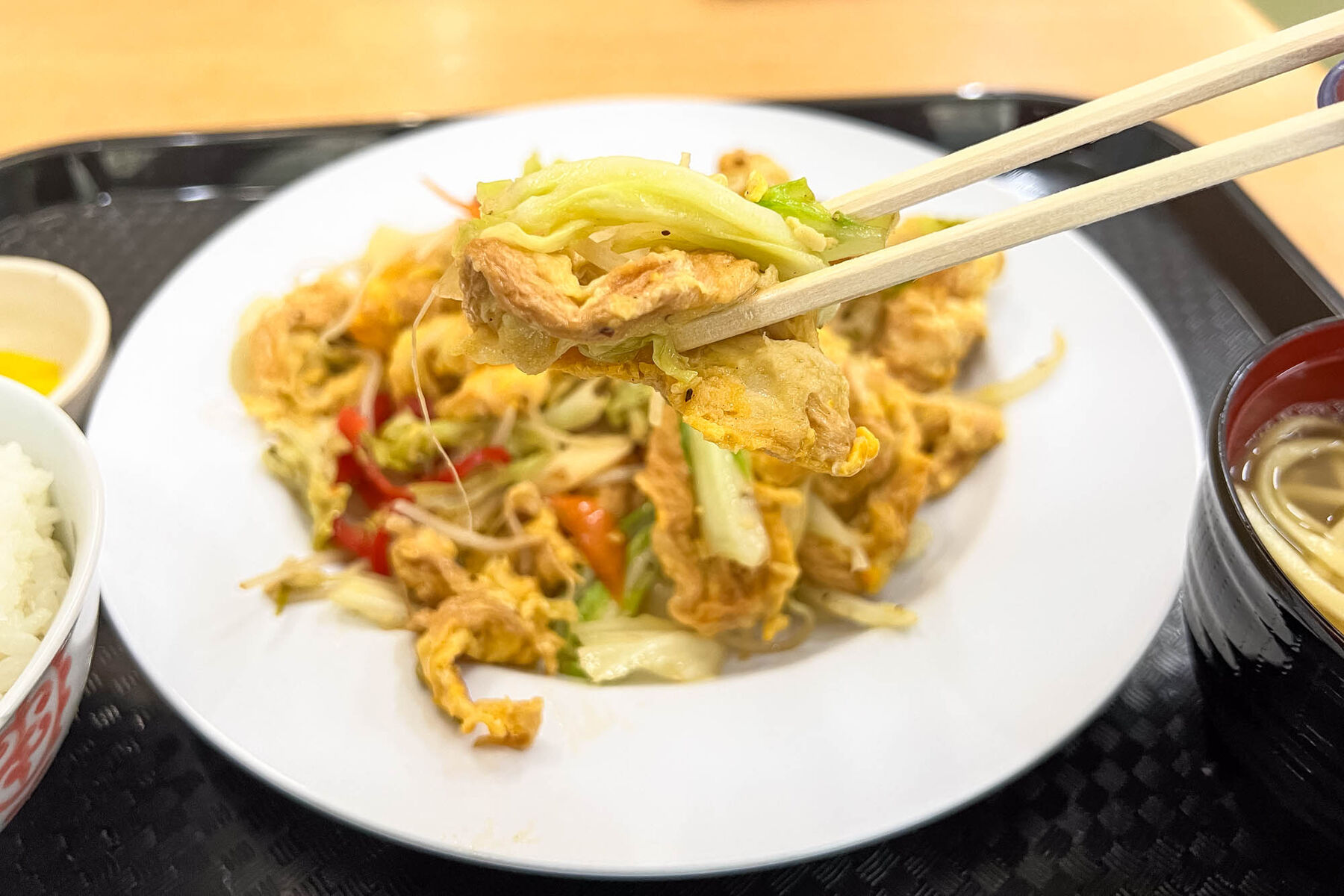 定食の汁物は安定の八重山そば。しっかり味のお出汁が◎ 定食にミニそばがついてくると嬉しいですよね。