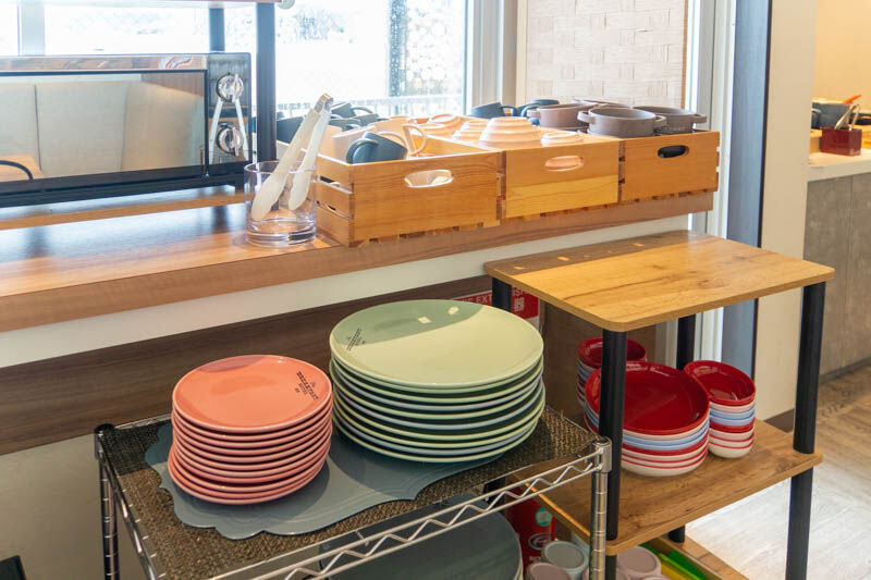 こちらの朝食はビュッフェスタイルなので、まずは可愛らしい色のお皿を選びます。