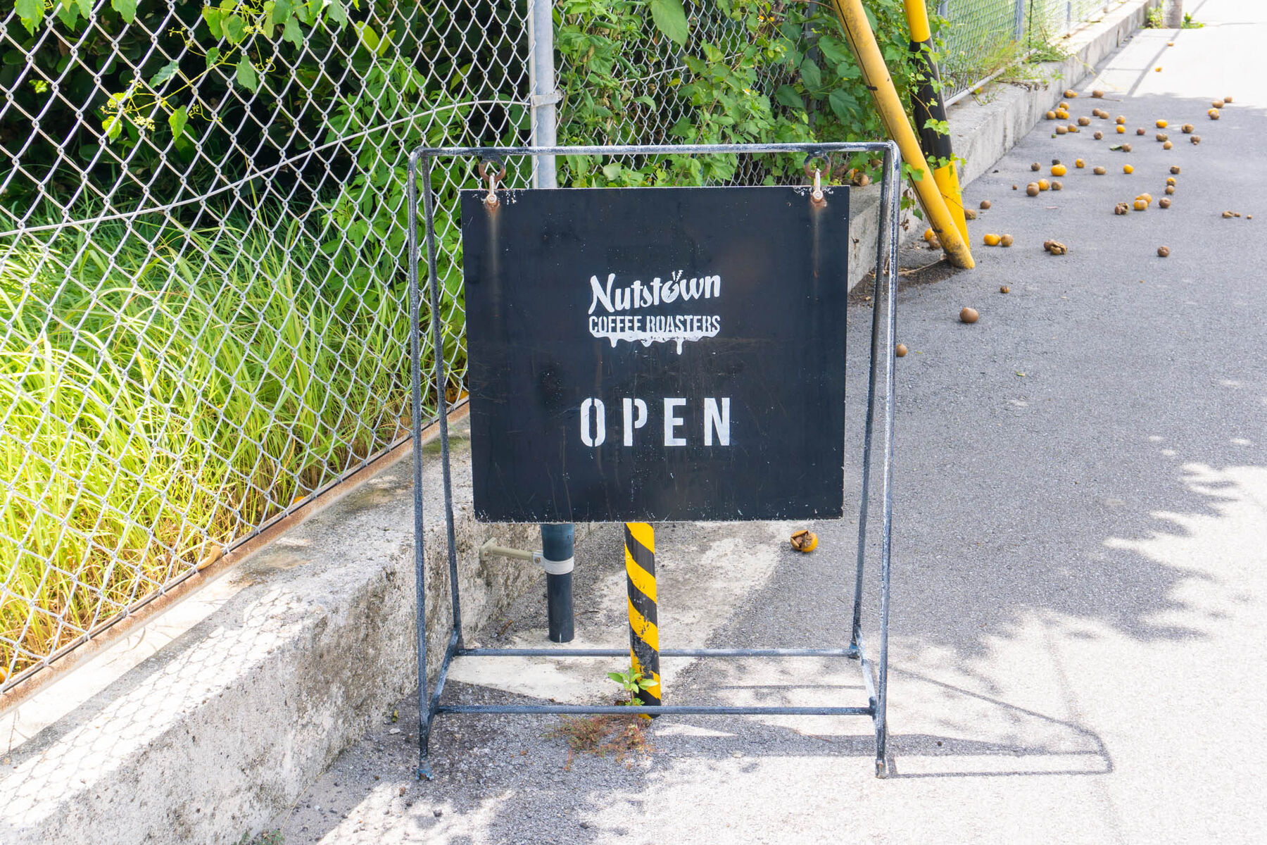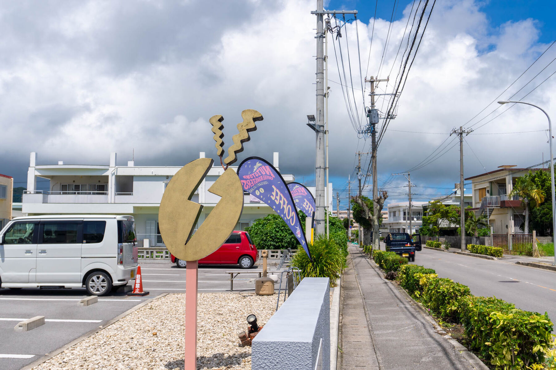 駐車場の入り口にあるお豆の看板がお店の目印になっています。