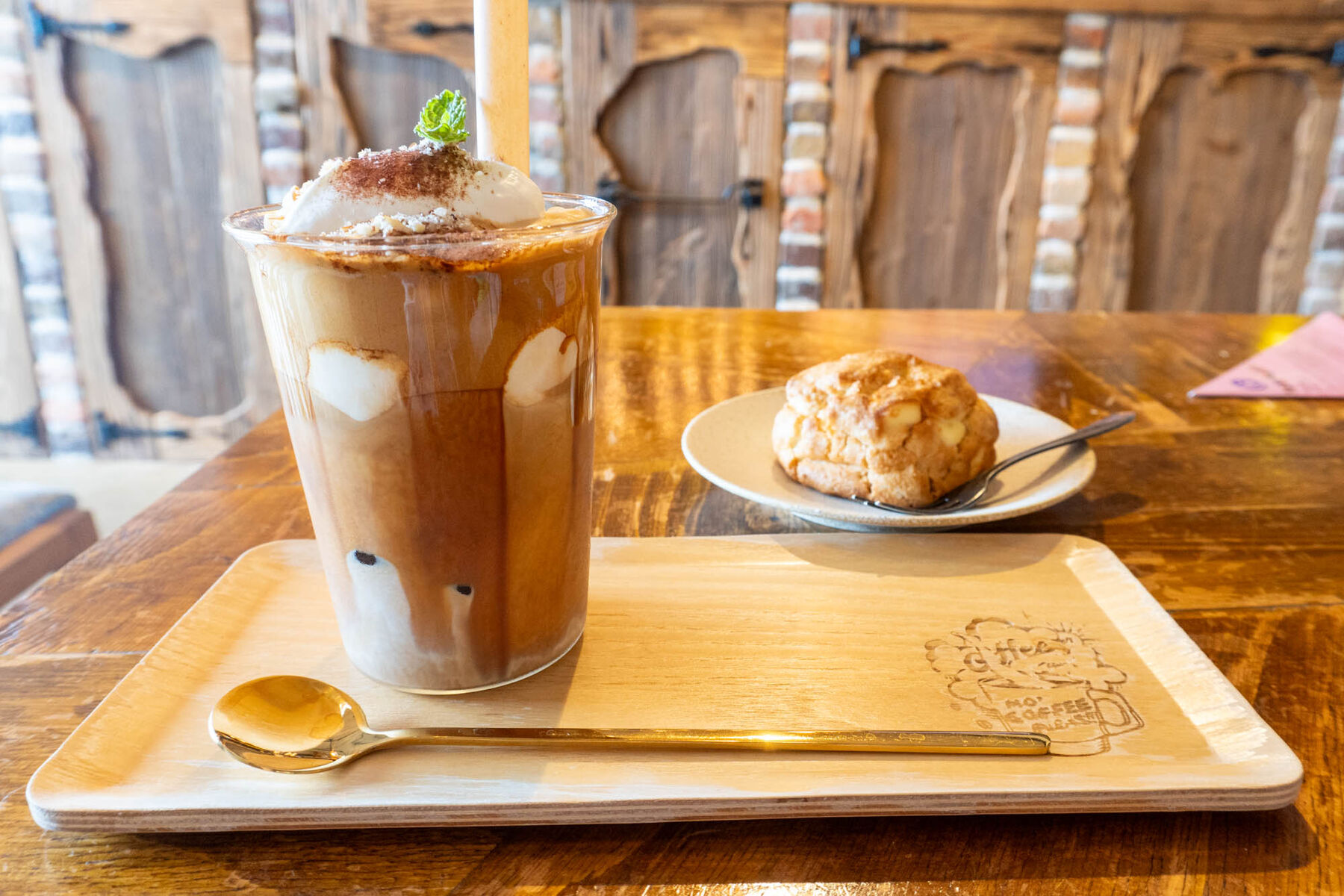 こちらは別の日にいただいた、「ナッティラテ(Mサイズ 700円) + ハニーメープルスコーン(350円)」