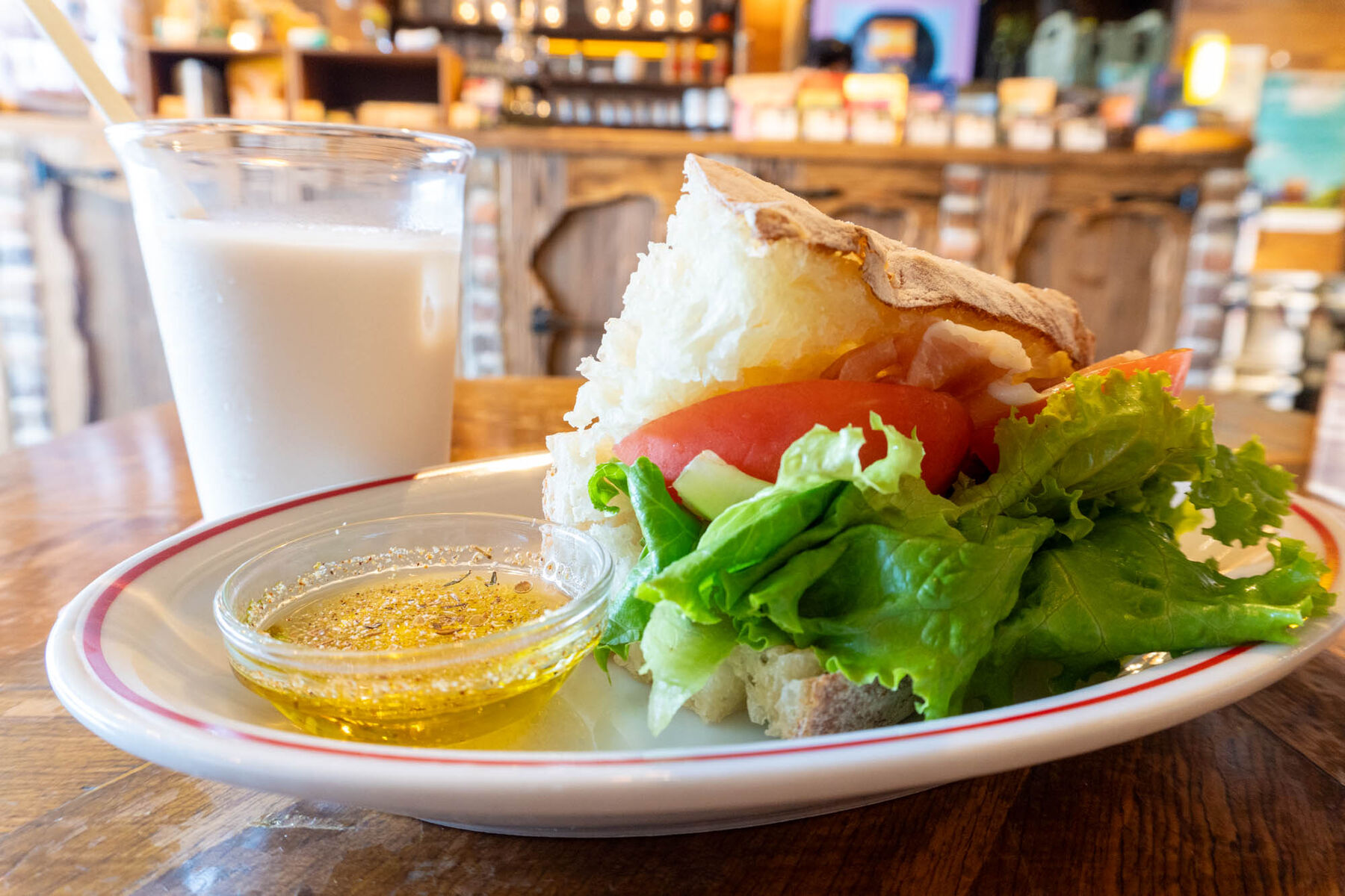 生ハム、レタス、トマト、マスタードでサンドされており、お好みでスパイス入りのオリーブオイルをつけながらいただきます!