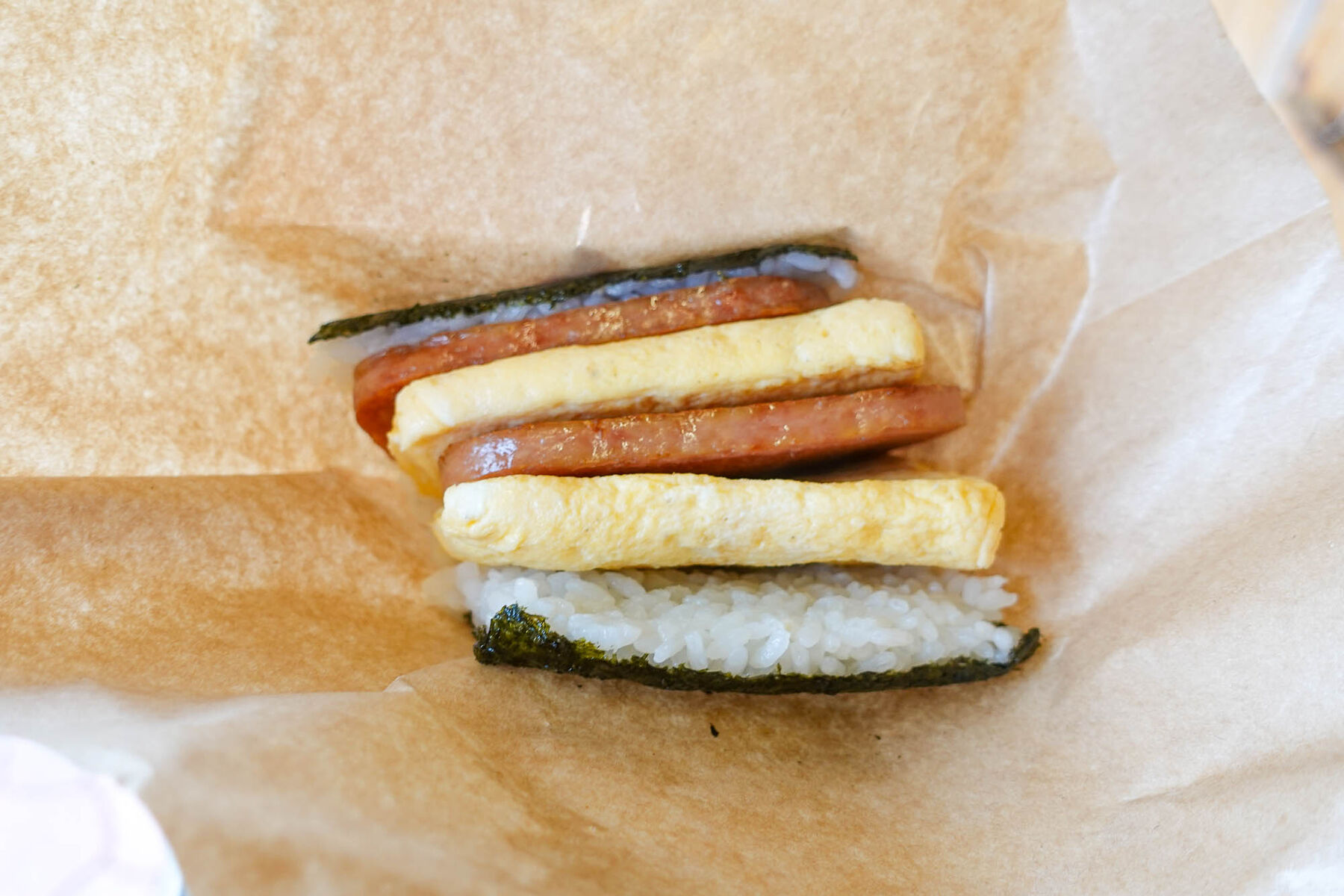 玉子とスパムが交互に挟まれていて、ボリューミー!スパムにも味がついていて、濃い味でお米と合う!!