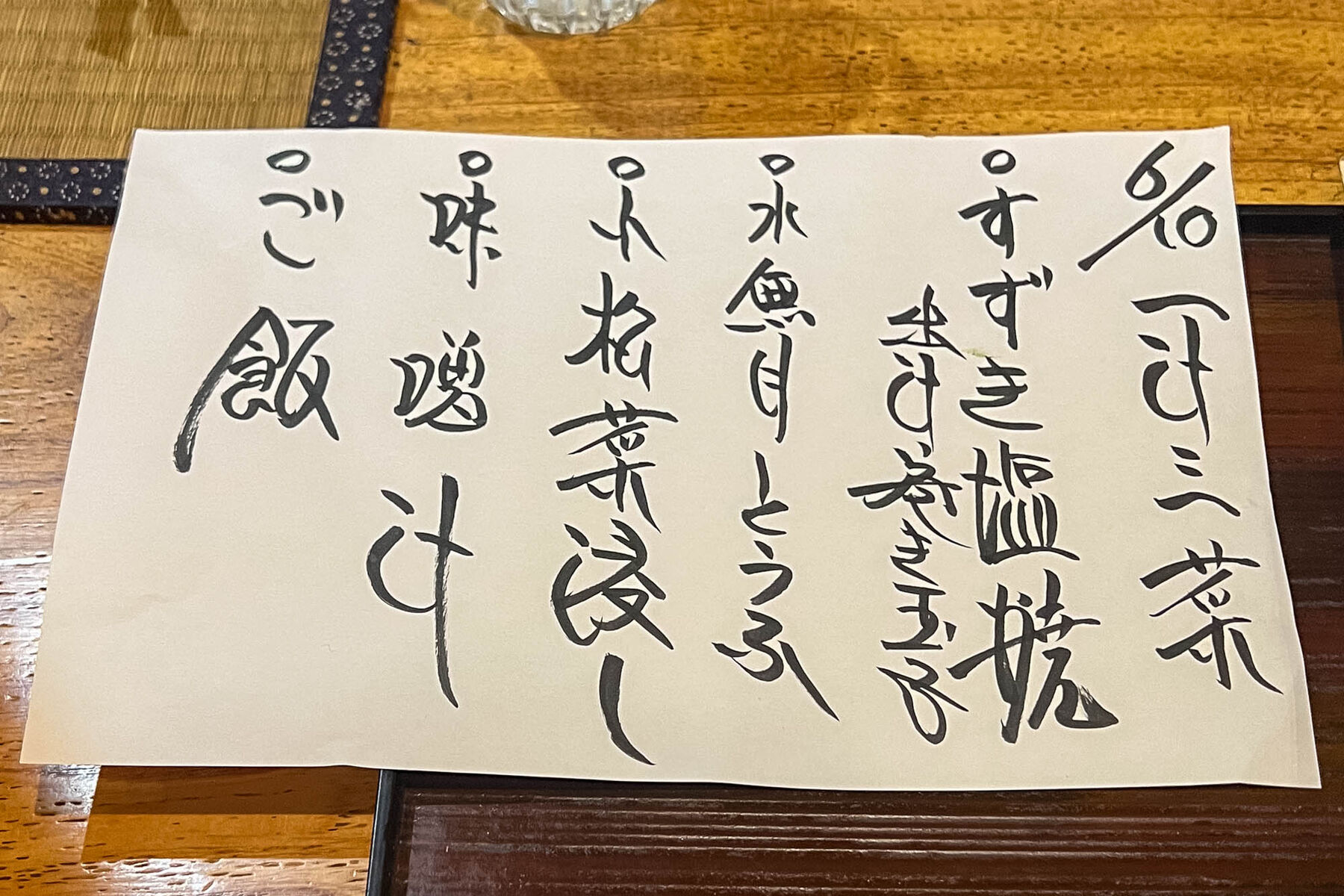 一汁三菜は毎日メニューが変わるようで、この日のメニューはこちら。