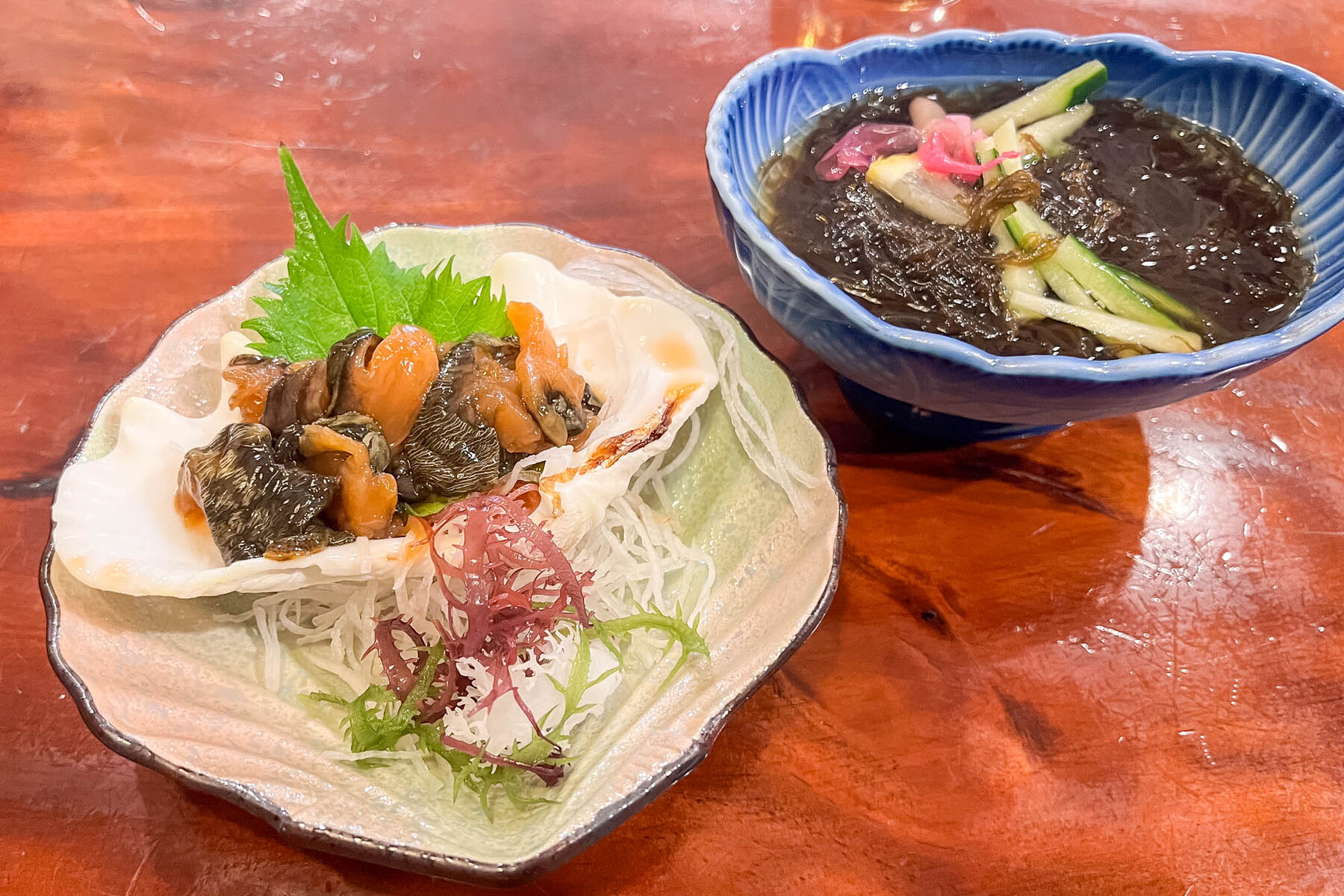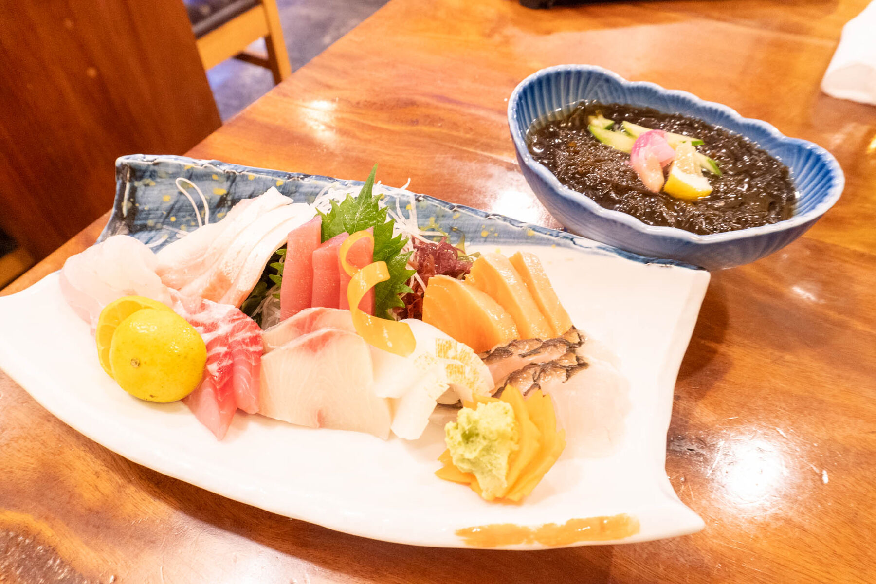 まずは安定の刺身盛り合わせ(小)ともずく酢を注文!お刺身はどれも分厚くて嬉しい。。