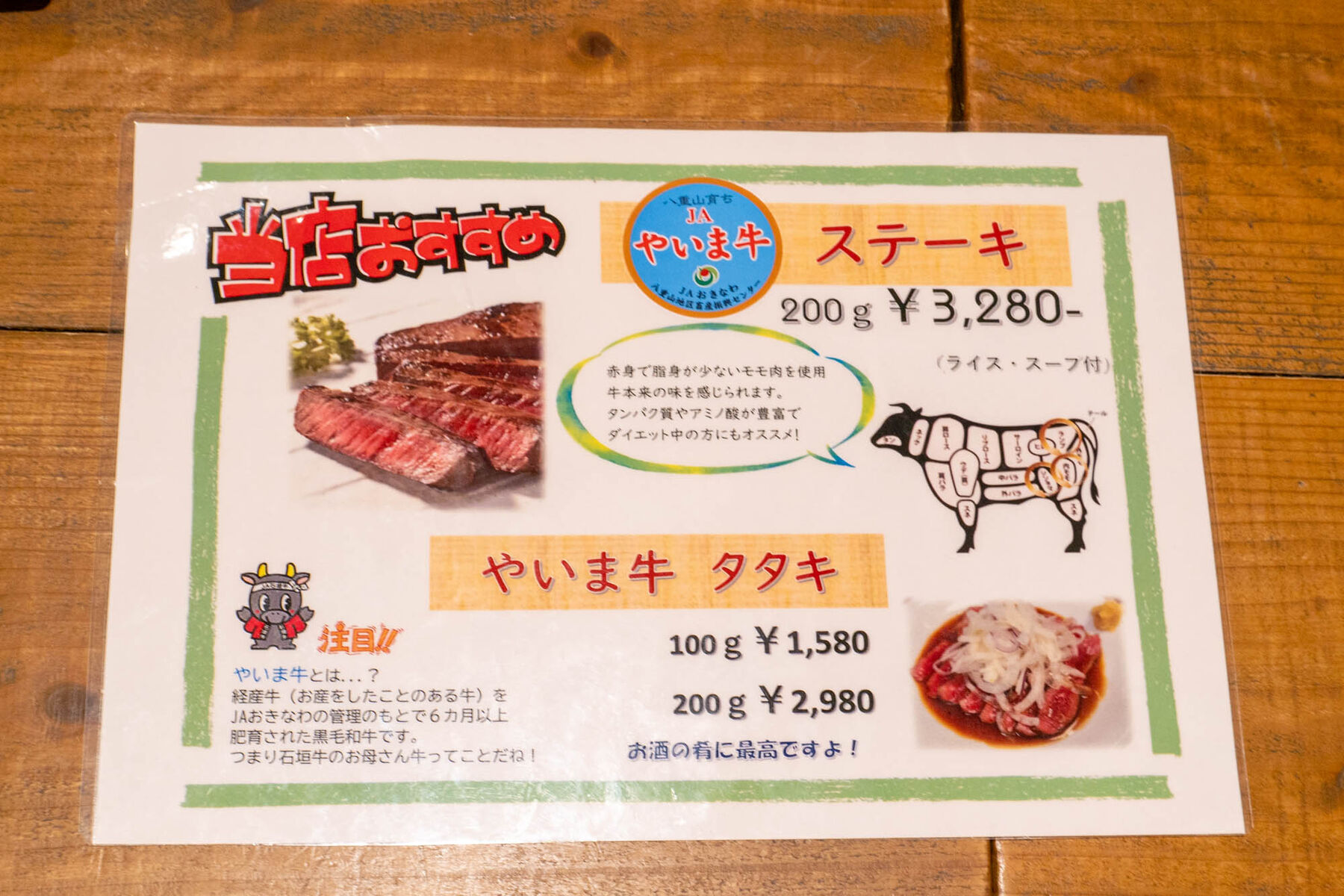 お店のおすすめのやいま牛のステーキなどなど。
