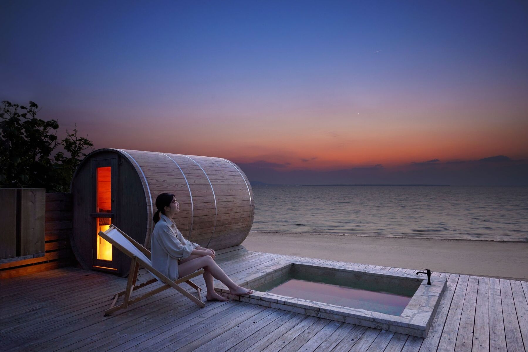 リゾナーレ小浜島のビーチに設置されたバレルサウナでは、朝焼けに染まる水平線を眺めながら、サウナと水風呂を行き来する至福のひとときを楽しめます。