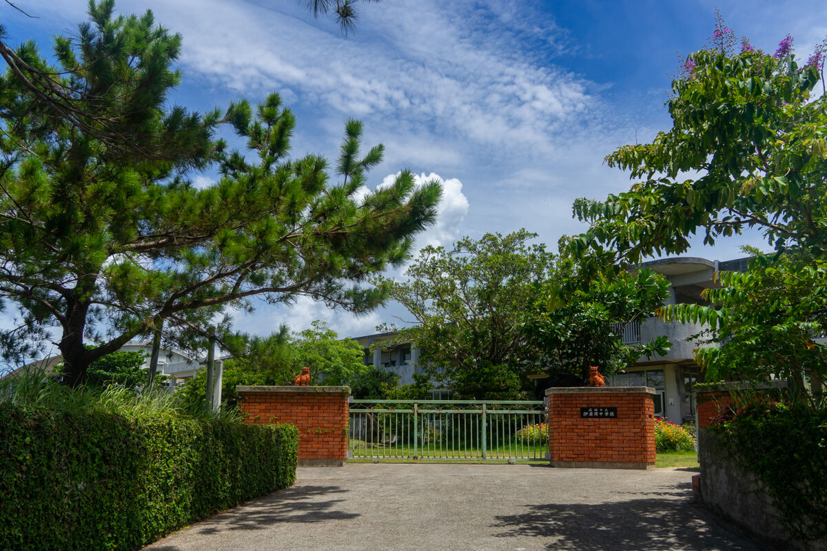 石垣島北東部の川久保半島にある中学校。公式サイトによると、16の集落からなる校区内はサトウキビ、パイン、花卉栽培や牧畜がさかん。