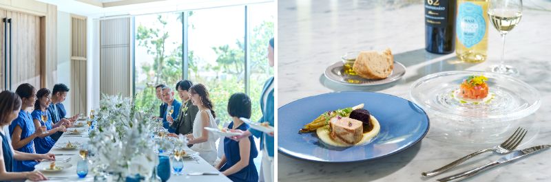 挙式後は、極上のダイニングで海の恵みを堪能しながら、至福のひとときをゲストと共有できます。