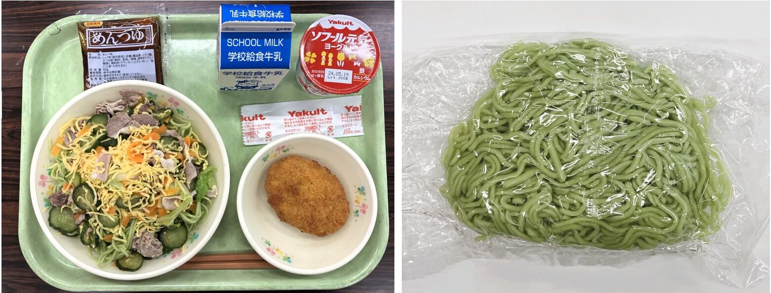 5月15日からの石垣市の給食には「ユーグレナクロレラ麺」という、石垣島ユーグレナとヤエヤマクロレラ粉末が練り込まれた麺を使った『美ら豚サラダめん』が導入されたみたい。