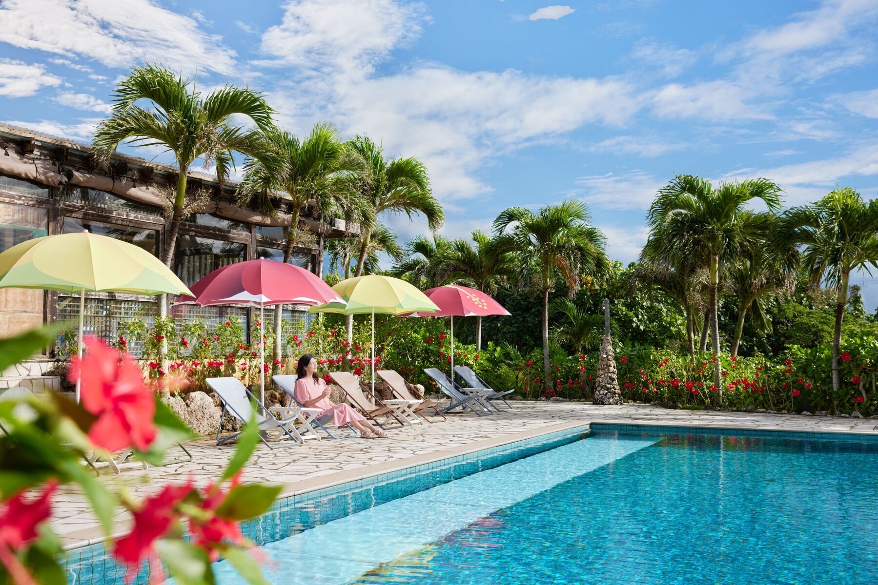 「南の島の花咲くリゾナーレ」小浜島では、ビーチプールサイドがハイビスカスで彩られ、見た目も可愛らしいフラワーモクテルを販売するみたい。