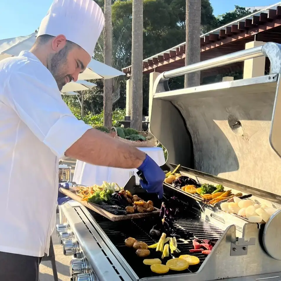 畑で採れたばかりの野菜を自らグリルして、ヴィラのプールサイドで味わう贅沢な時間。