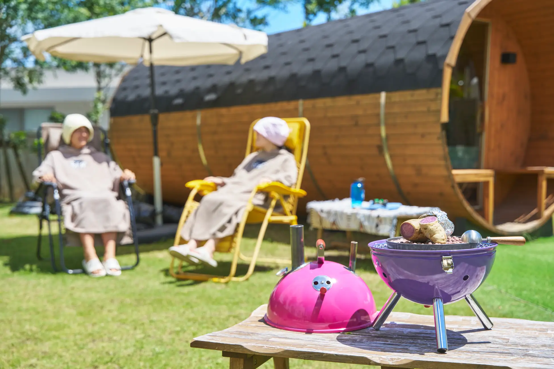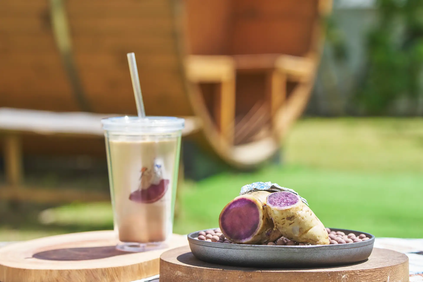 ホテルの屋外に設置されたバレルサウナは、最大100℃の熱気と、16〜18℃に整えられた水風呂を備えた本格仕様。その隣にはなんと「芋専用サウナ」が登場。ゲストがととのう時間と同じタイミングで、紅芋がホクホクの焼き芋へと変身します。