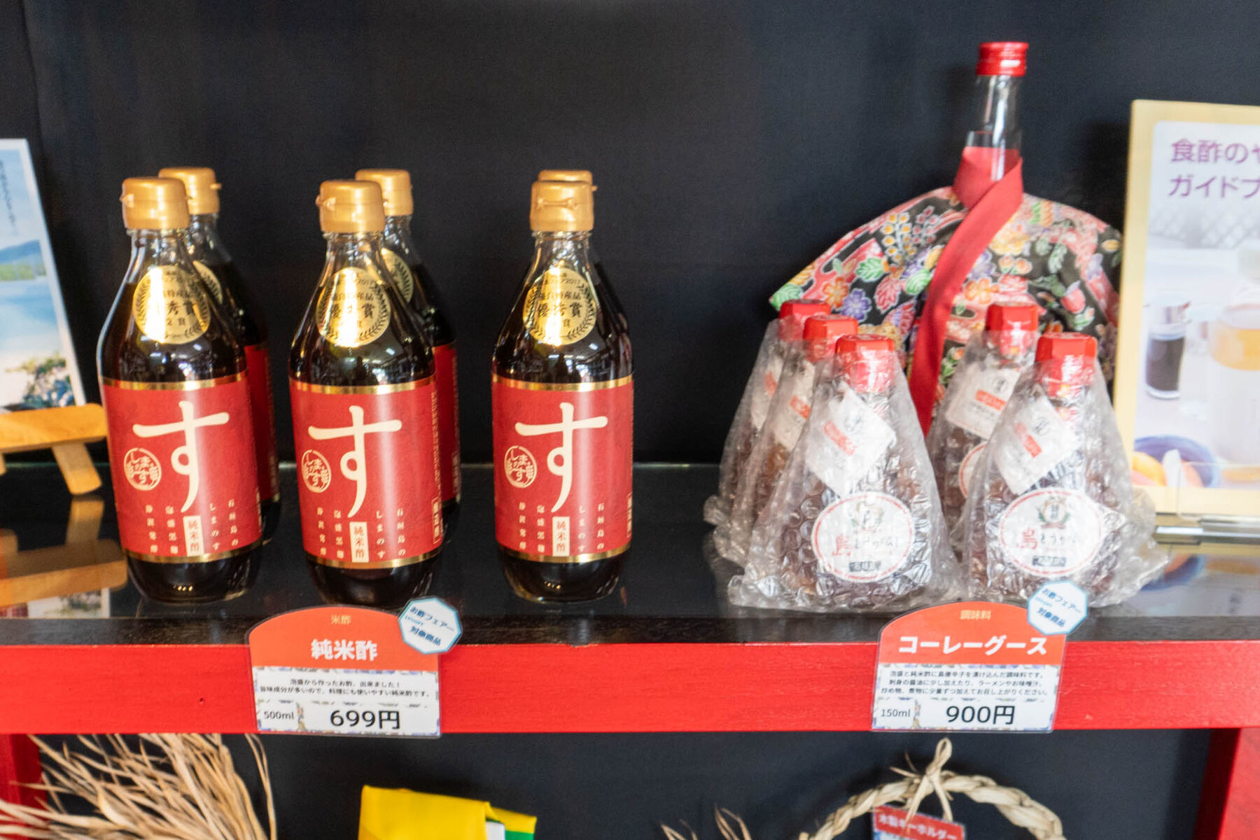 (請福酒造が販売している純米酢とコーレーグースの写真)