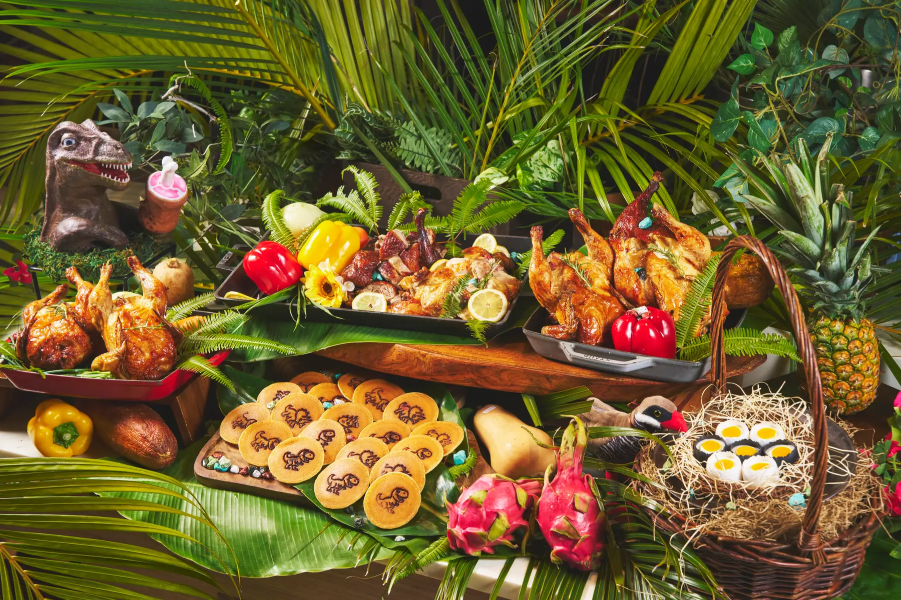 森の生命力を感じさせるダイナミックな一皿「丸鶏のロースト」をはじめ、恐竜の足あとが愛らしい「ダイナソーパンケーキ」、ヤンバルクイナの卵をモチーフにしたココナッツムース「ヤンバルクイナのたまご」など、メニューには遊び心がいっぱい。